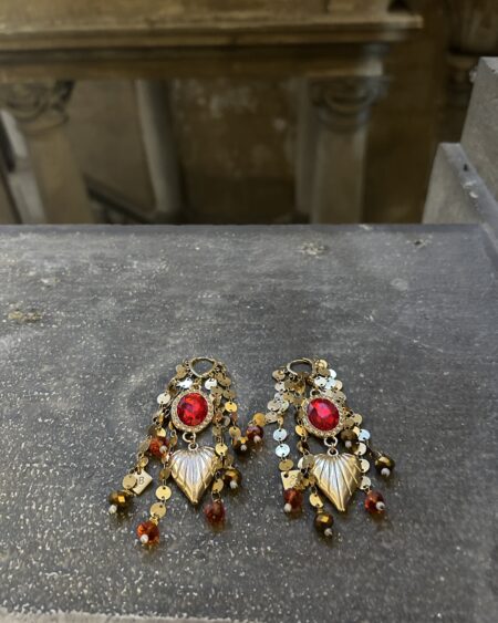 Bellissimi orecchini lunghi, a buco, color oro con pendenti rossi Swarovski e cuori