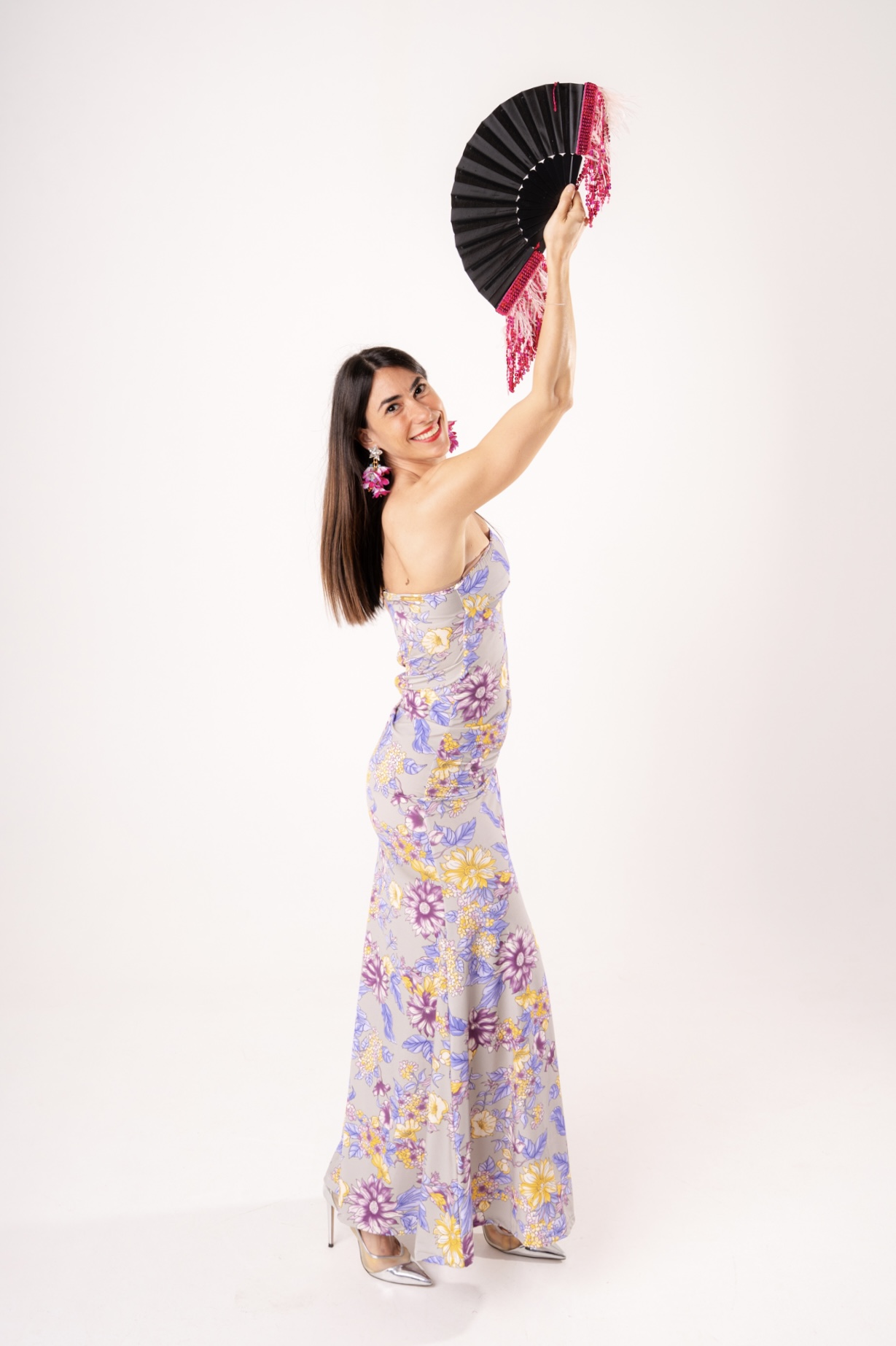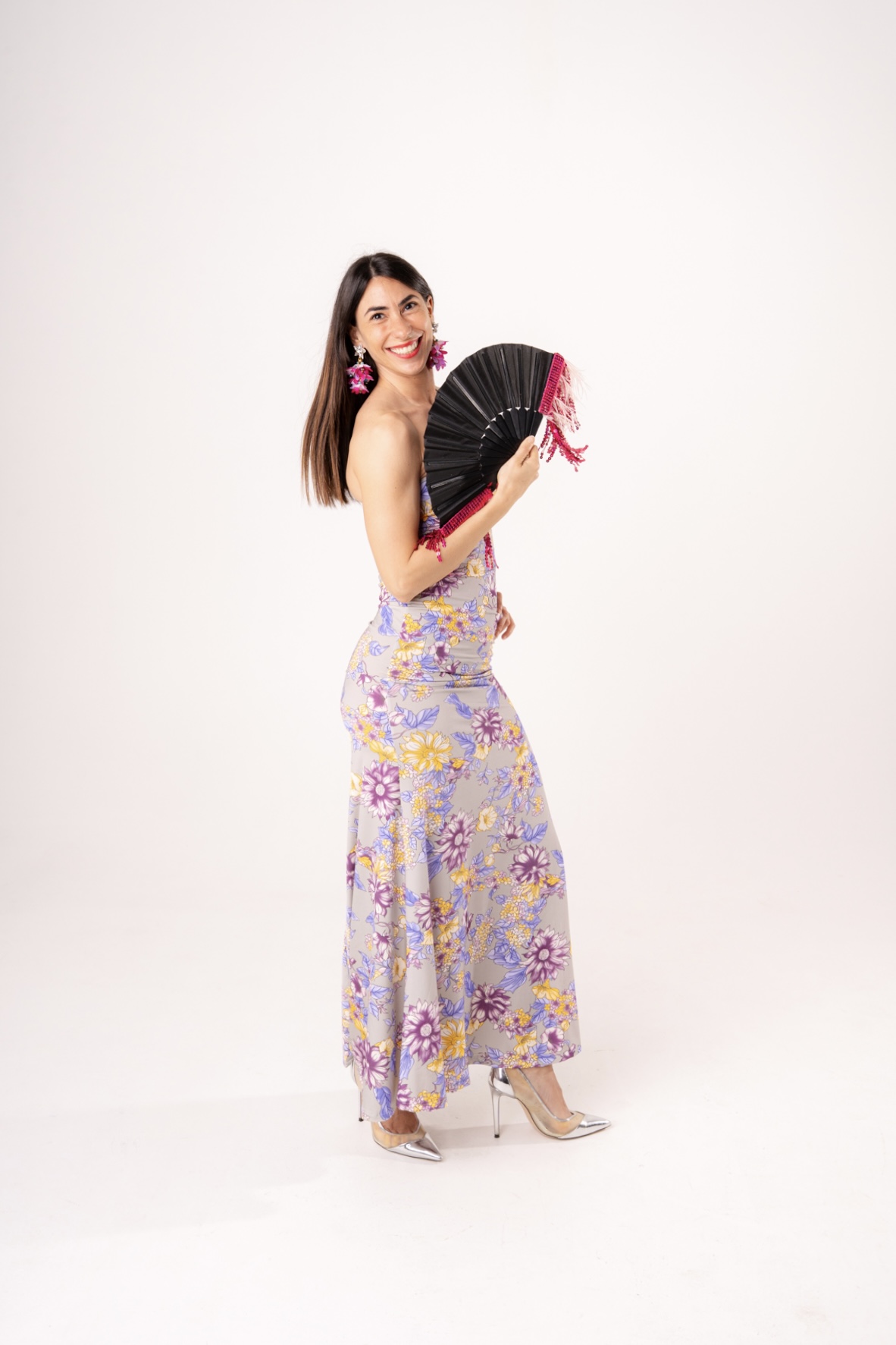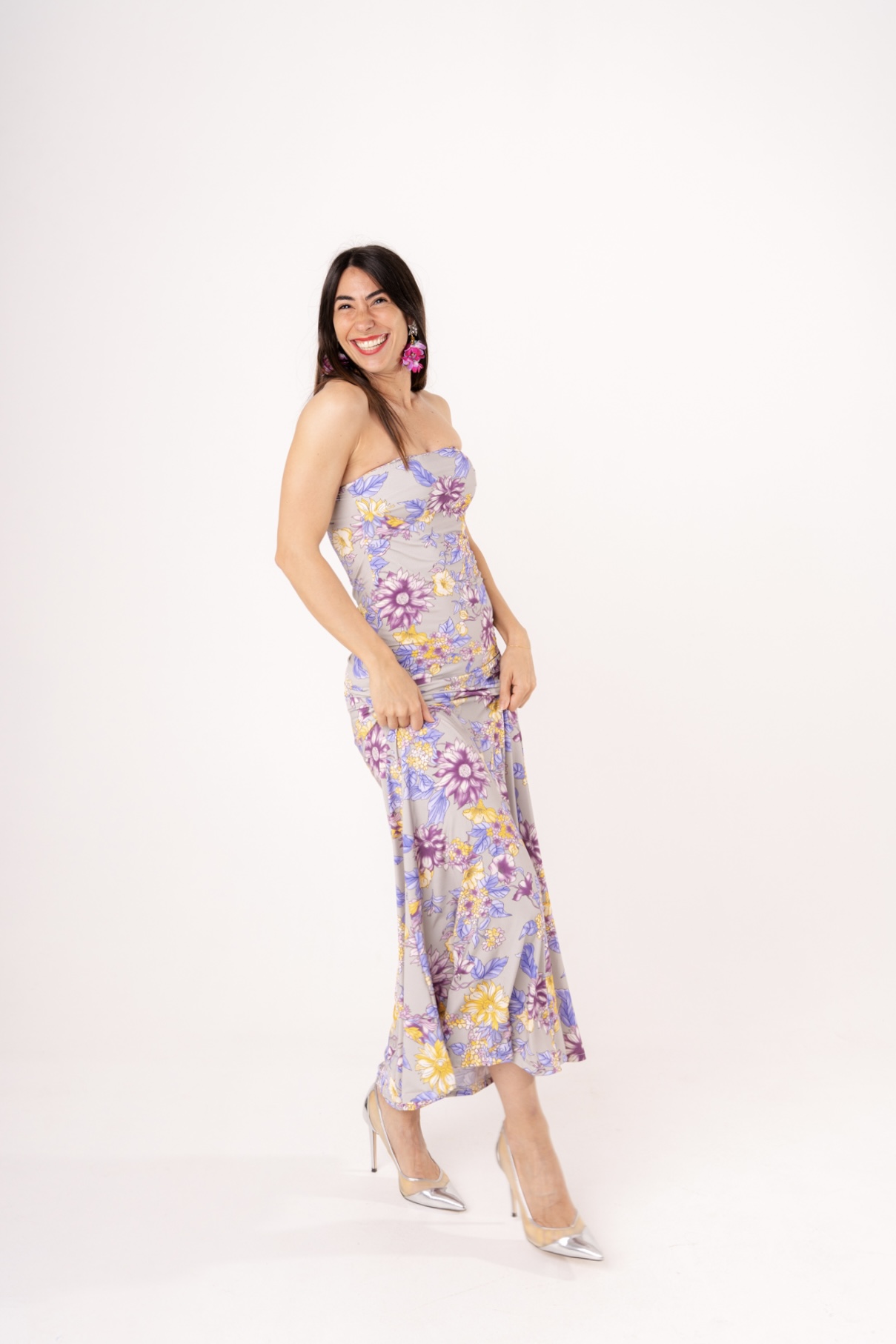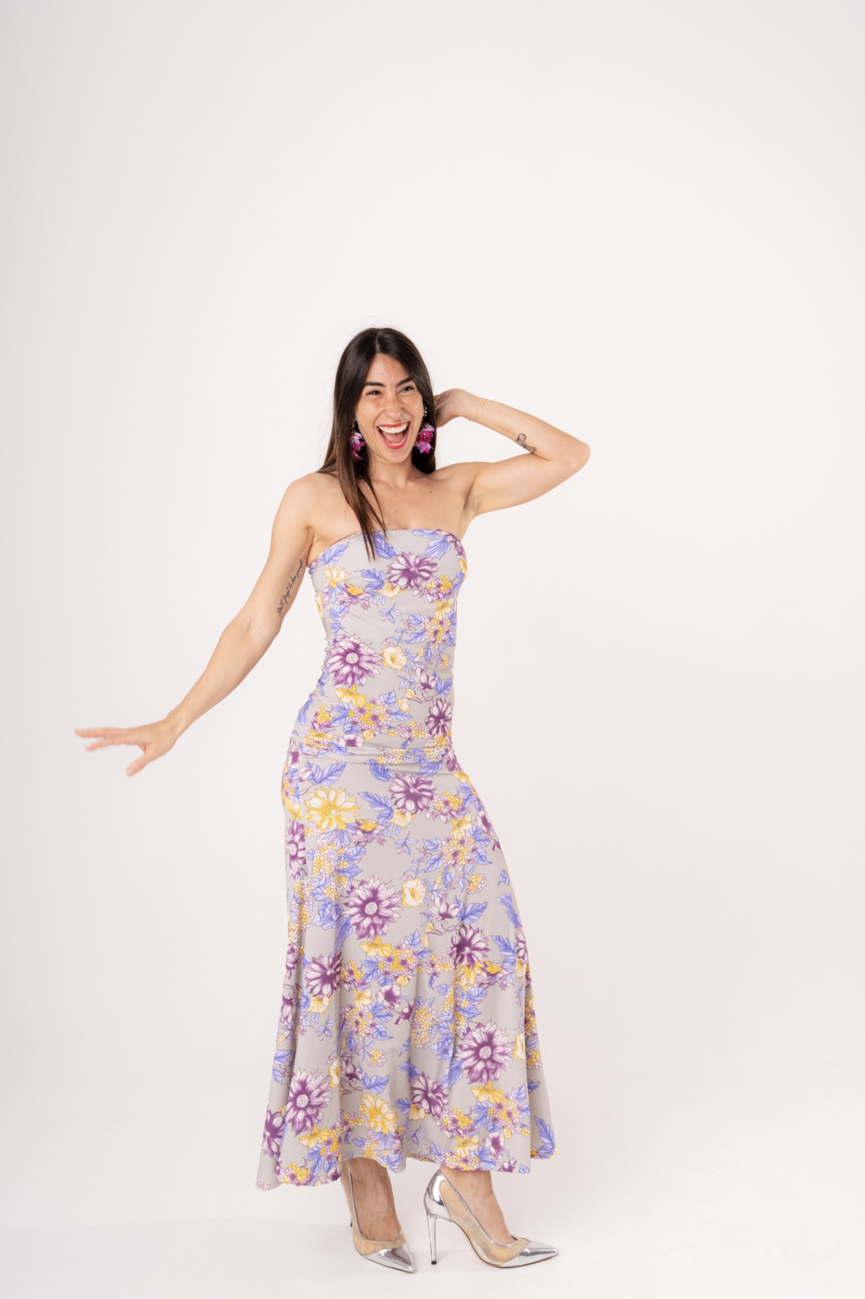 Esalta la tua silhouette con il nostro abito a sirena senza spalline, il mix perfetto tra comfort e glamour. Caratterizzato da una raffinata stampa floreale nei toni del lilla, giallo e viola su fondo grigio perla, questo vestito è realizzato in tessuto elasticizzato di alta qualità che accarezza le curve senza costringere. Il design a tubino si apre dolcemente sul fondo, garantendo un movimento fluido e sofisticato. Ideale per un matrimonio estivo, un cocktail party o una serata speciale sotto le stelle.