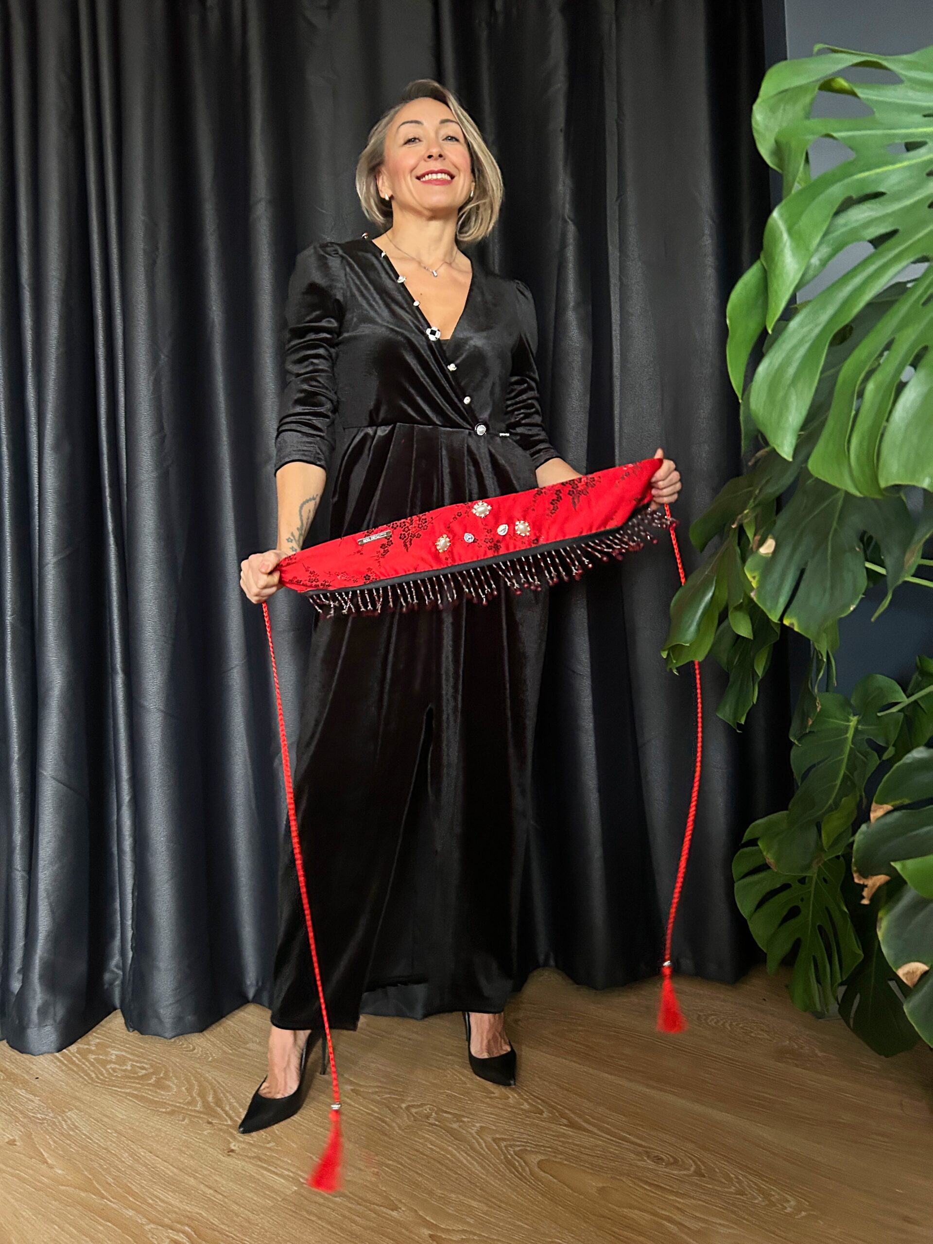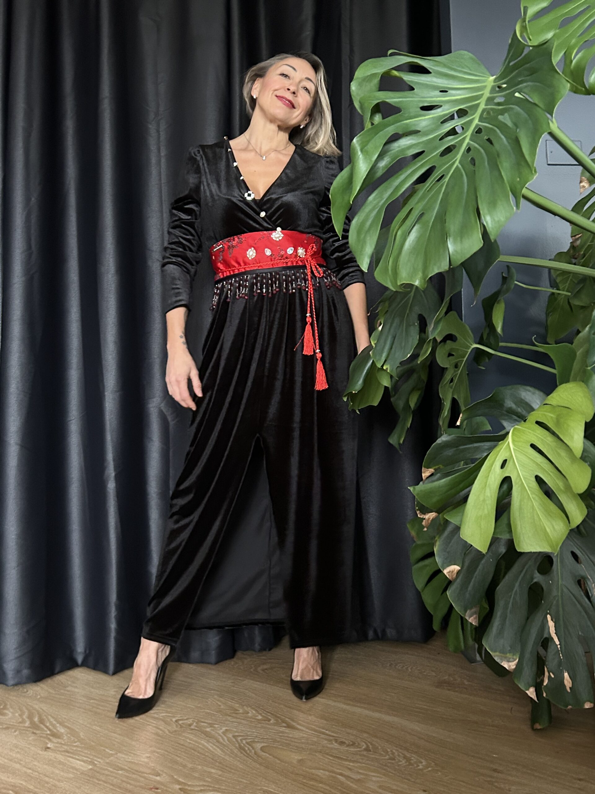 Abito in velluto nero elasticizzato con dettagli di bottoni smaltati e swarovsky. La cinta la trovi nella sezione accessori.