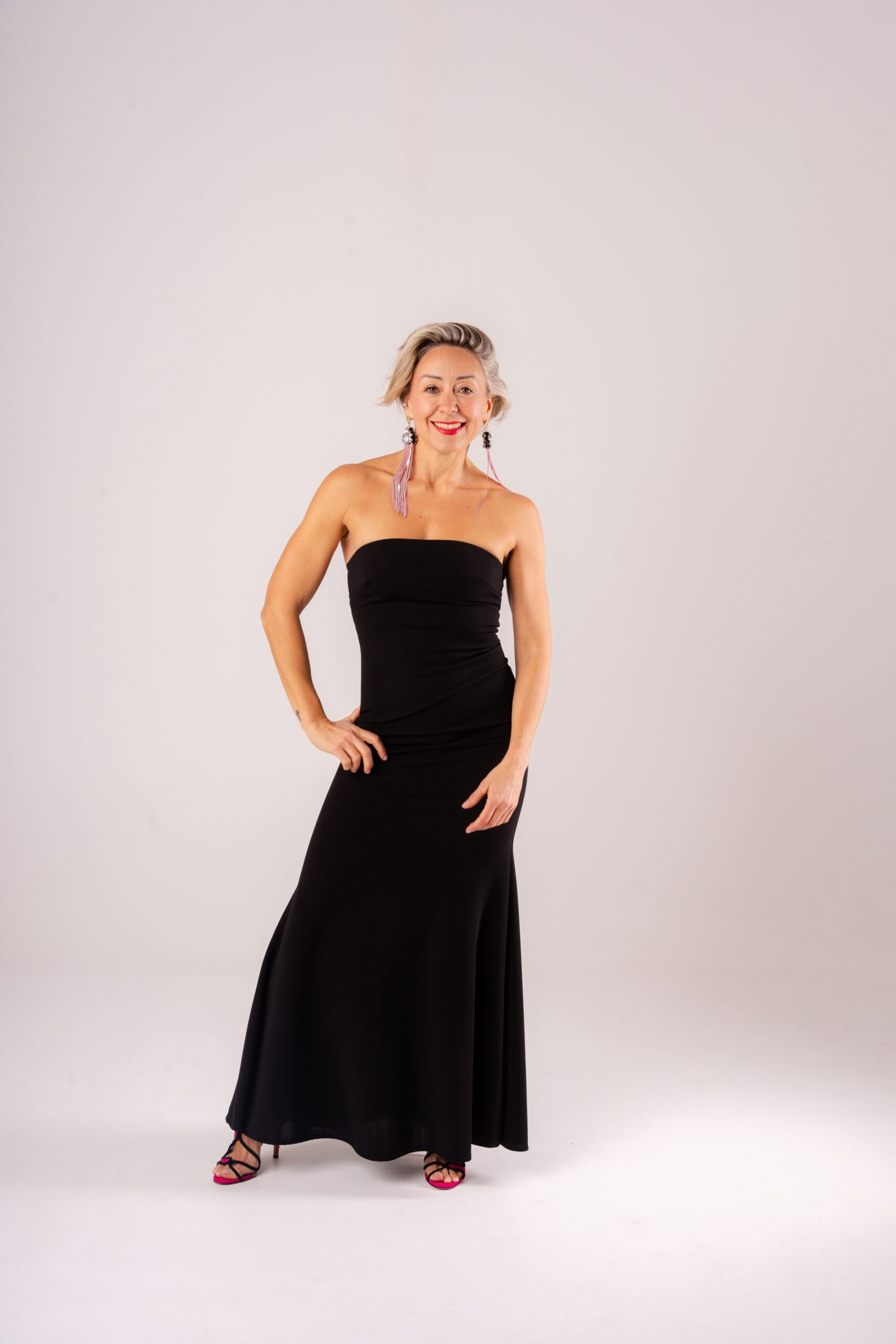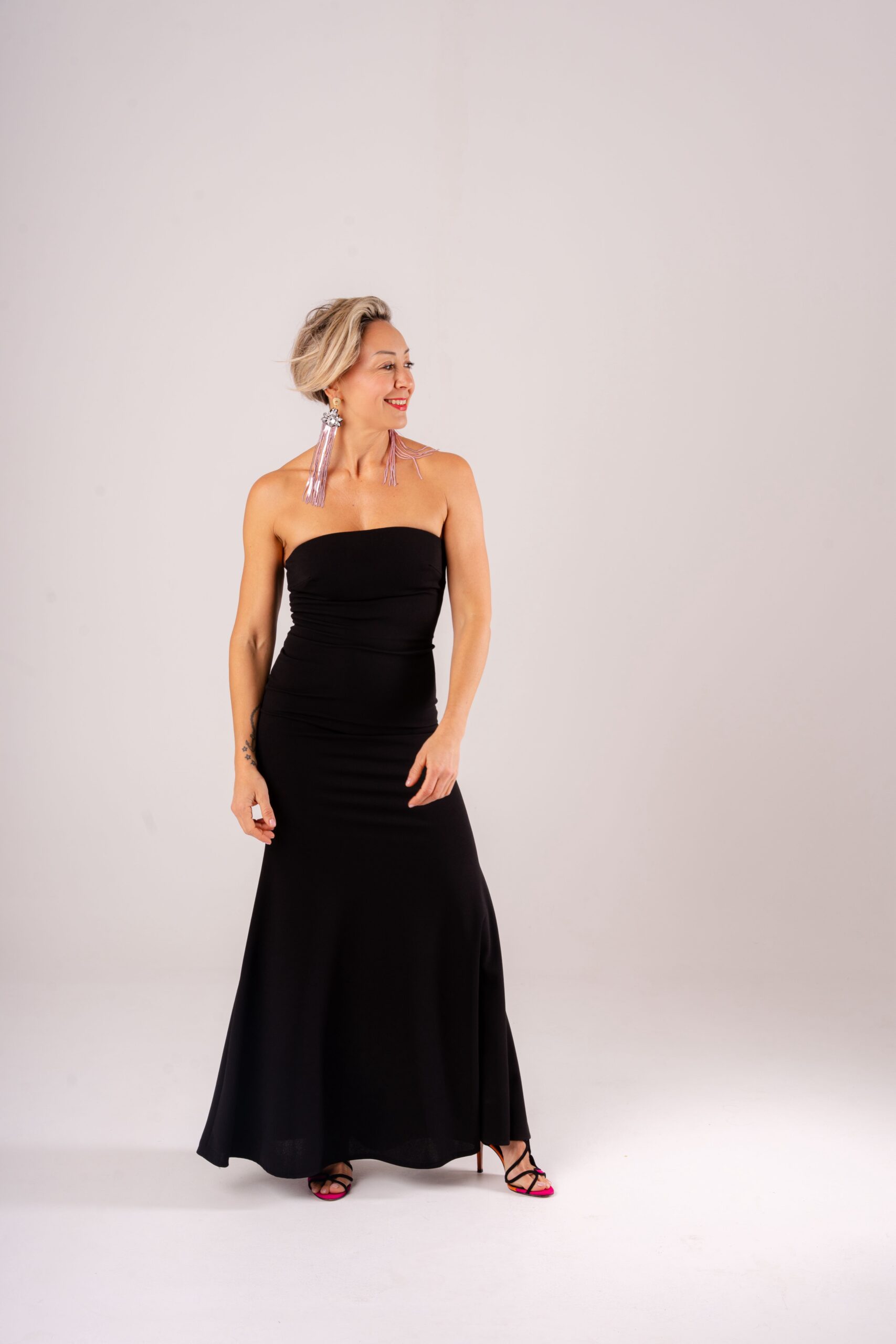 • Colore nero classico • Modello senza spalline (strapless) • Taglio aderente sul busto • Gonna lunga fluida e femminile • Perfetto per cerimonie, eventi e serate eleganti • Facile da abbinare con accessori statement • Look sofisticato e senza tempo