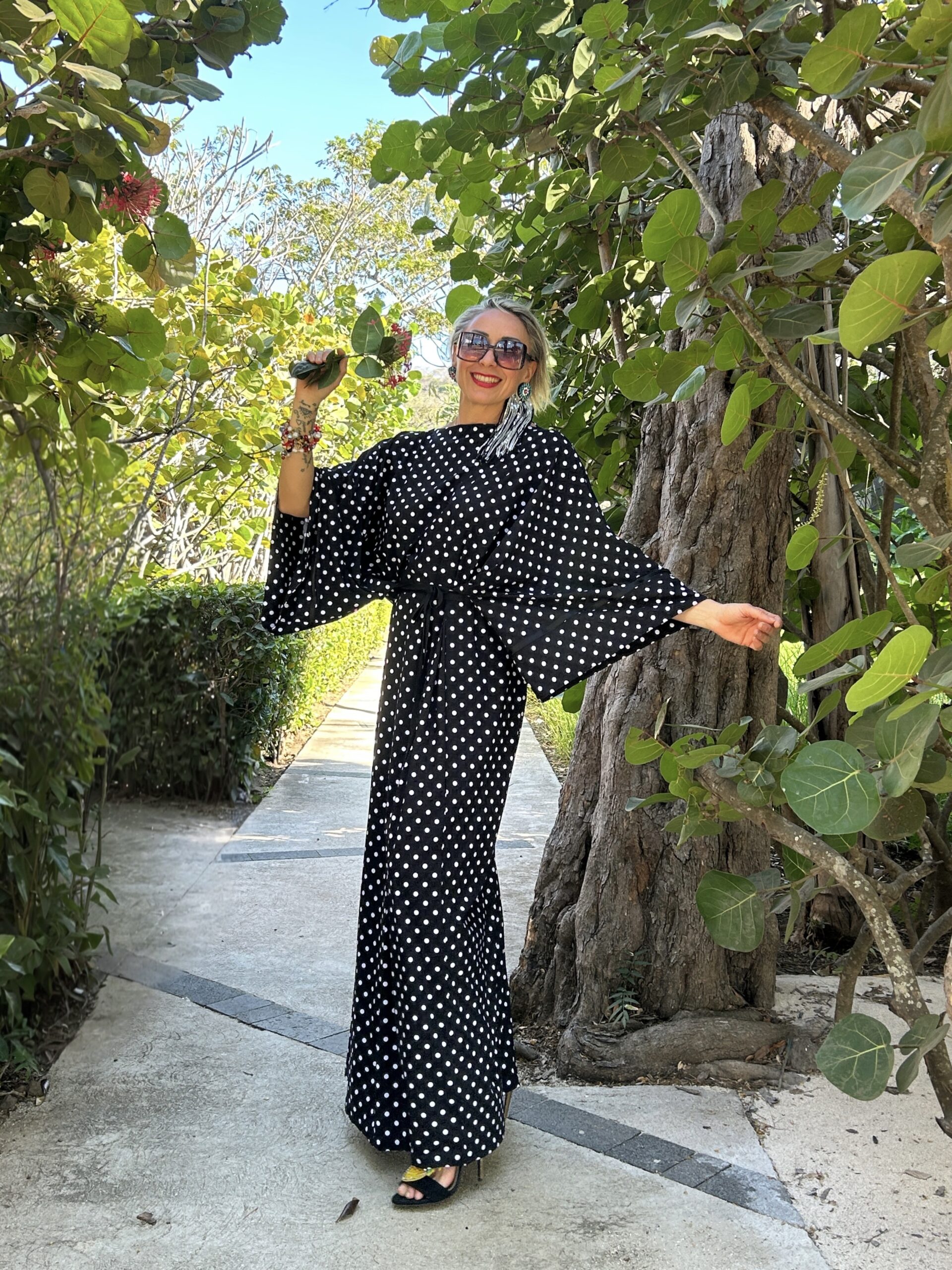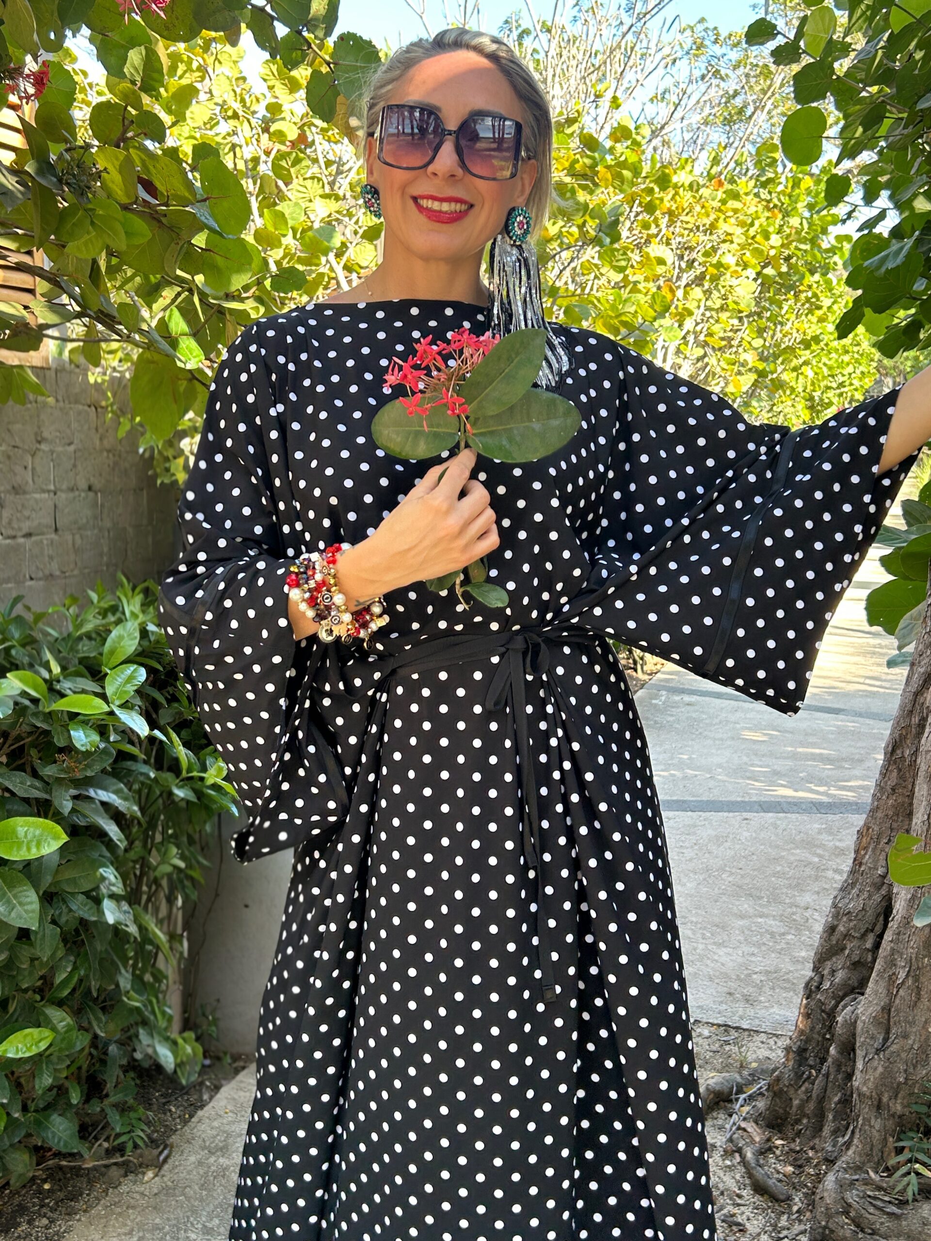 Abito lungo donna in elegante fantasia nero con pois bianchi, perfetto per un look raffinato e femminile. Il design con maniche ampie stile kimono dona movimento e leggerezza, mentre la cintura in vita valorizza la silhouette creando una vestibilità armoniosa e confortevole.
