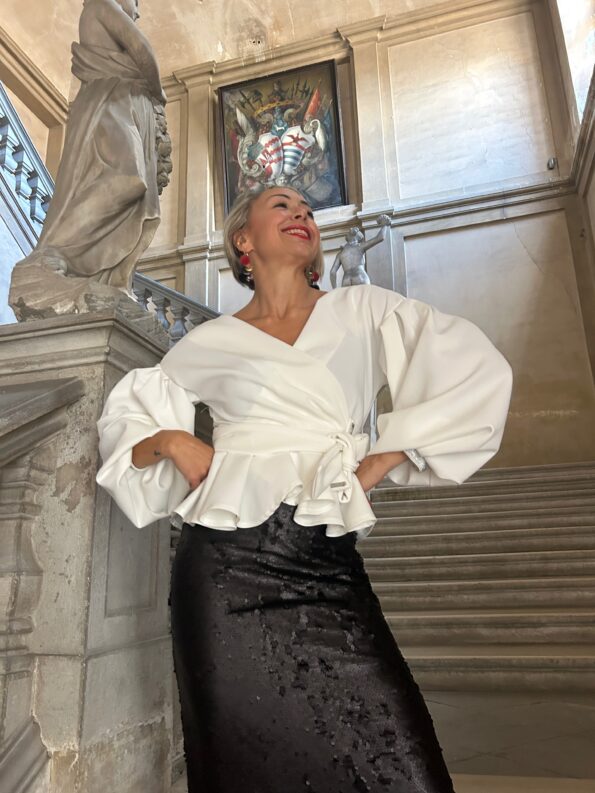 Camicia bianca con maniche a sbuffo, elastico argentato con stelle applicate e regolabile in vita grazie alle fasce.