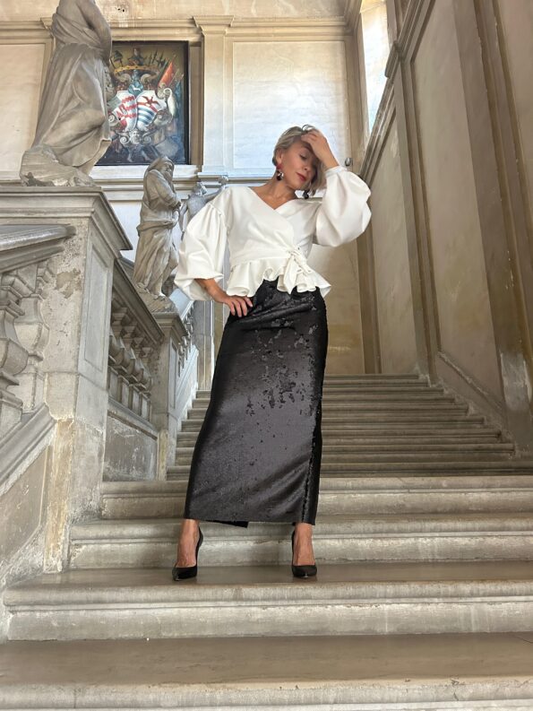 Camicia a goccia in viscosa gessata lurex bronzo con inserti di tessuto broccato e frange in paillettes.