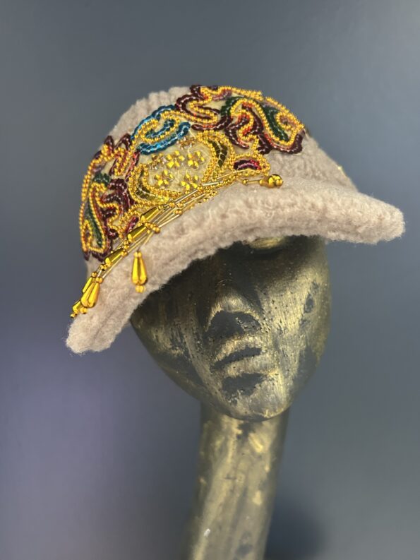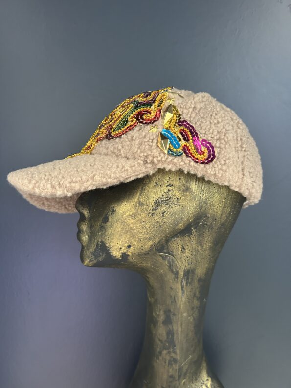 Cappello modello Cap in ‘Teddy’, base color avorio con disegno intrecciato di paillettes multicolore e perline pendenti color oro