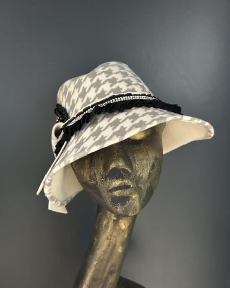 Cappello color panna e fantasia ‘Pied de Poule’ tortora con applicazione di perline nere, Swarovsky e tulle nero intorno.