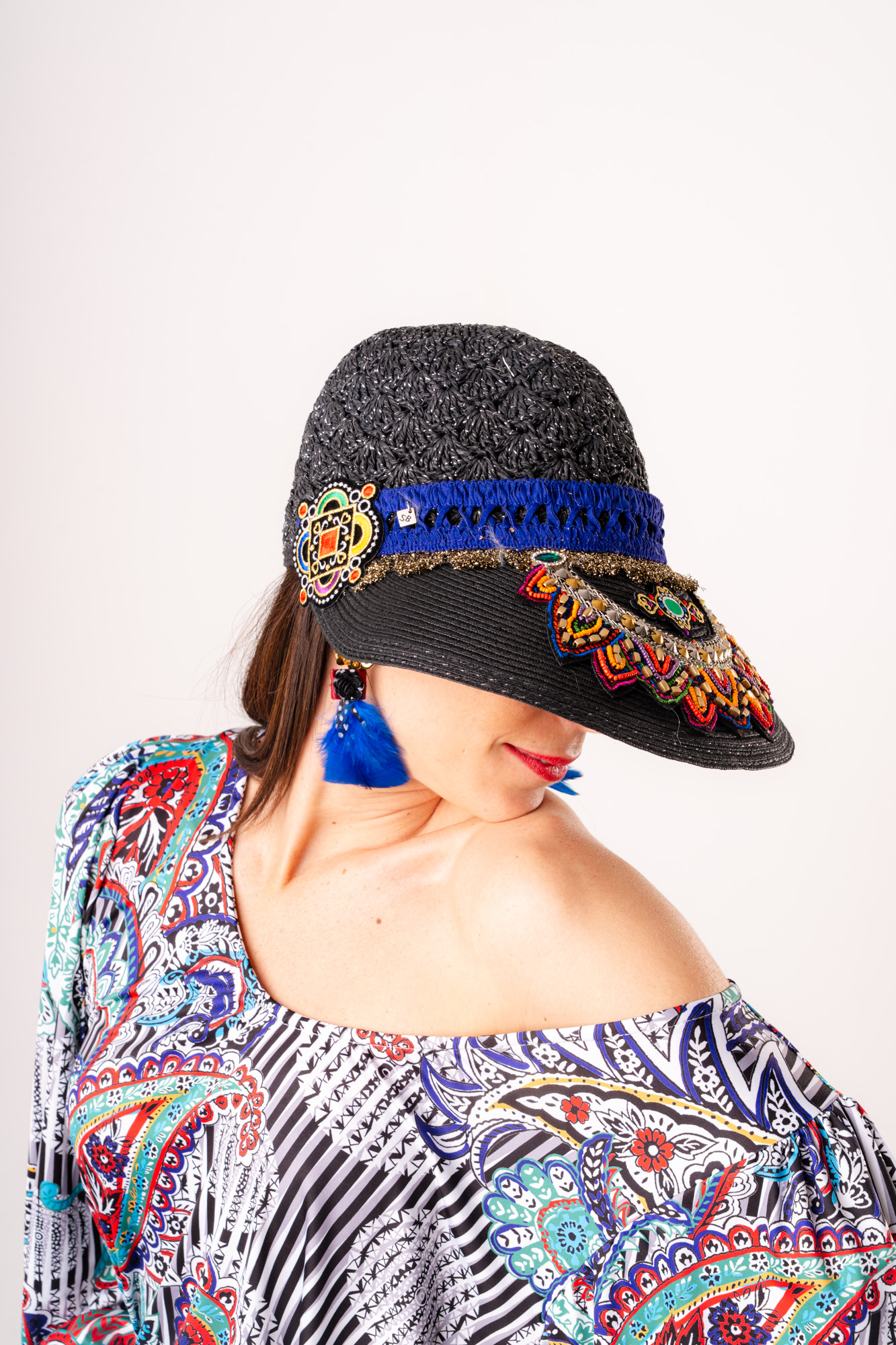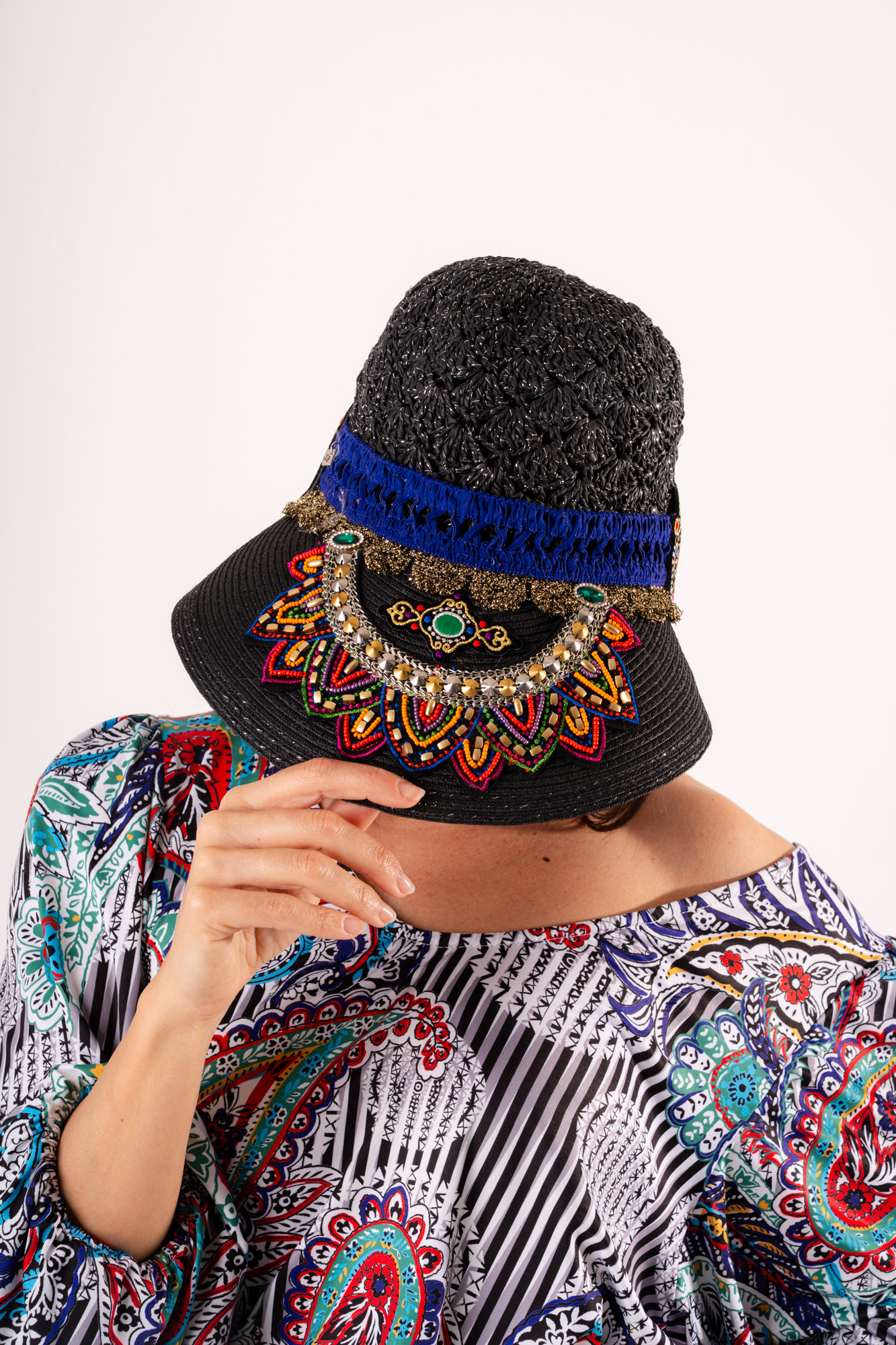 Eleva il tuo look estivo con questo esclusivo cappello in rafia nera, un mix perfetto tra artigianalità e design contemporaneo. Caratterizzato da una calotta lavorata a crochet e una tesa impreziosita da ricami vivaci e dettagli gioiello, è l’accessorio indispensabile per chi ama distinguersi con eleganza durante le vacanze o in città.