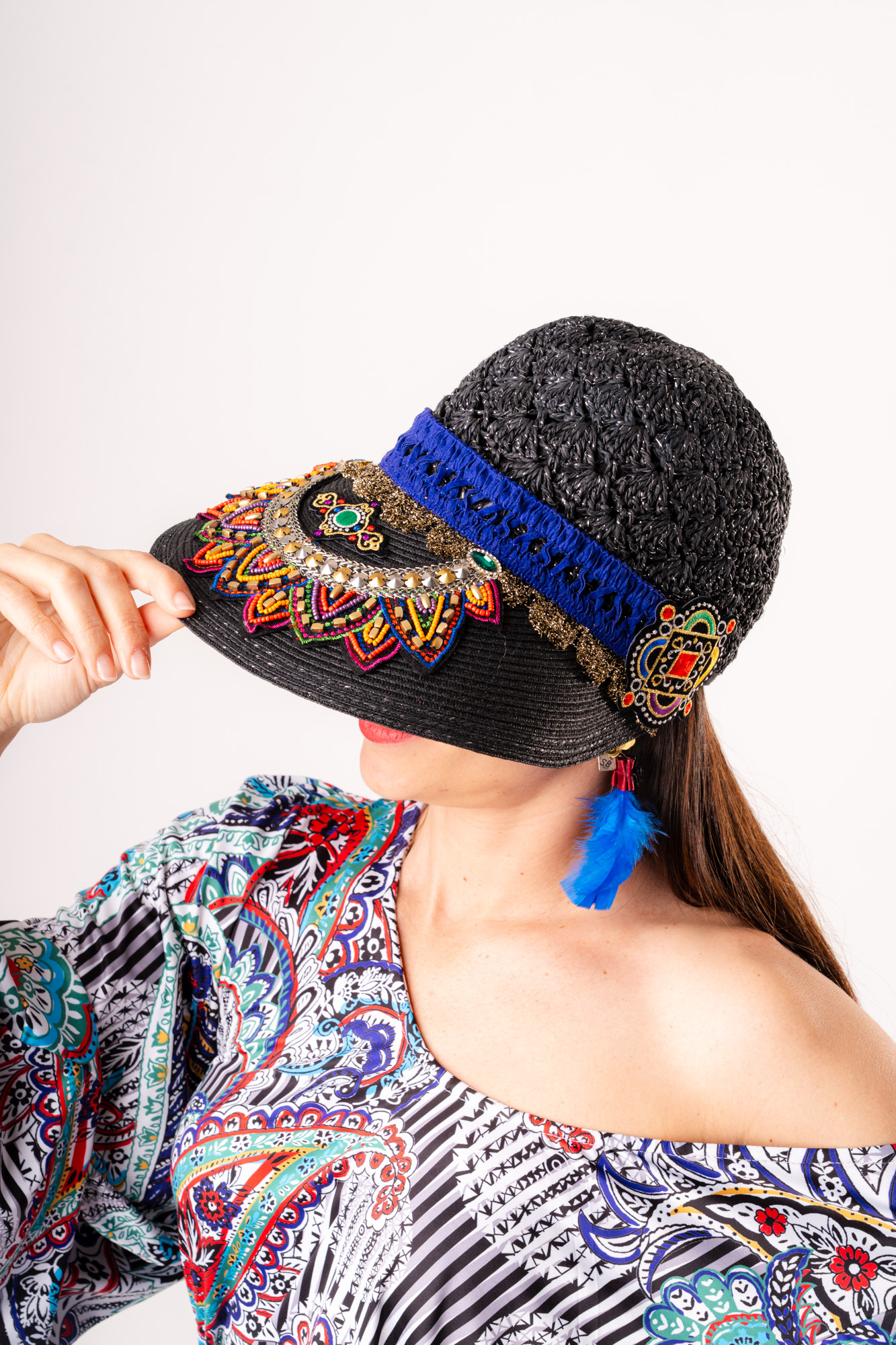 • Dettagli Preziosi: Tesa decorata con applicazioni ricamate a mano, perline multicolore e inserti in metallo dorato dal sapore etnico.