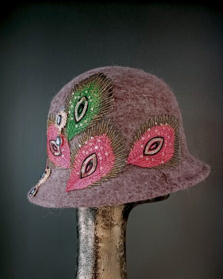 Bellissimo cappello in lana cotta nelle diverse gradazioni del viola, impreziosito da foglie colorate ricamate e pendenti Swarowsky viola e oro