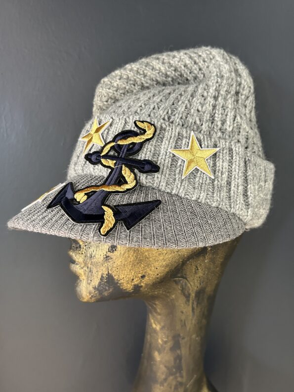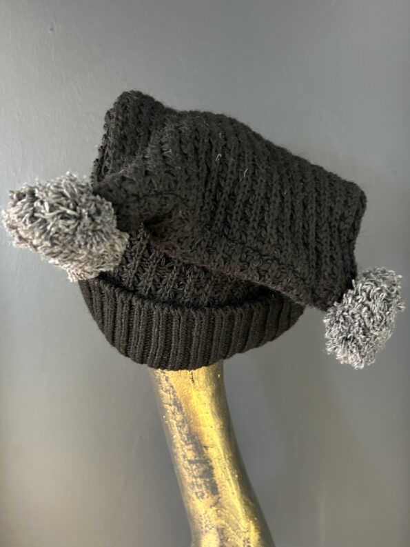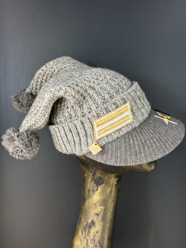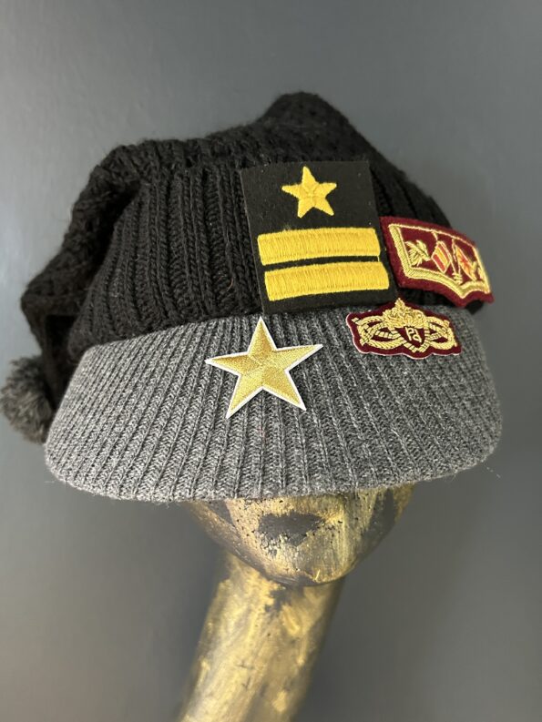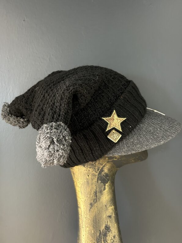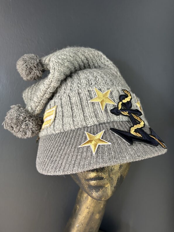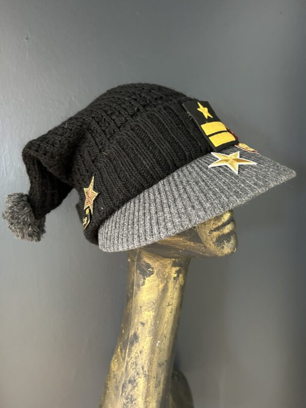 Cappello mod. cuffietta in lana con dettagli militari, stelle e pon pon in punta. Colori nero e grigio