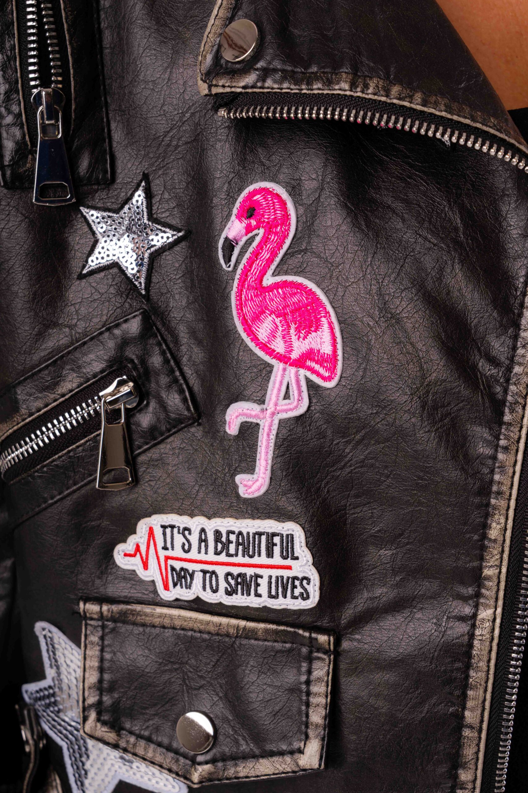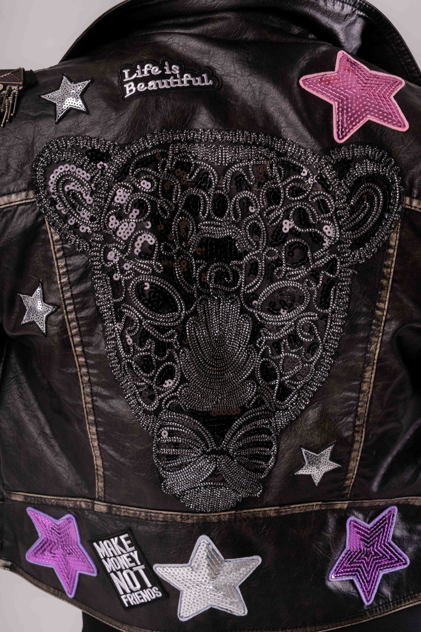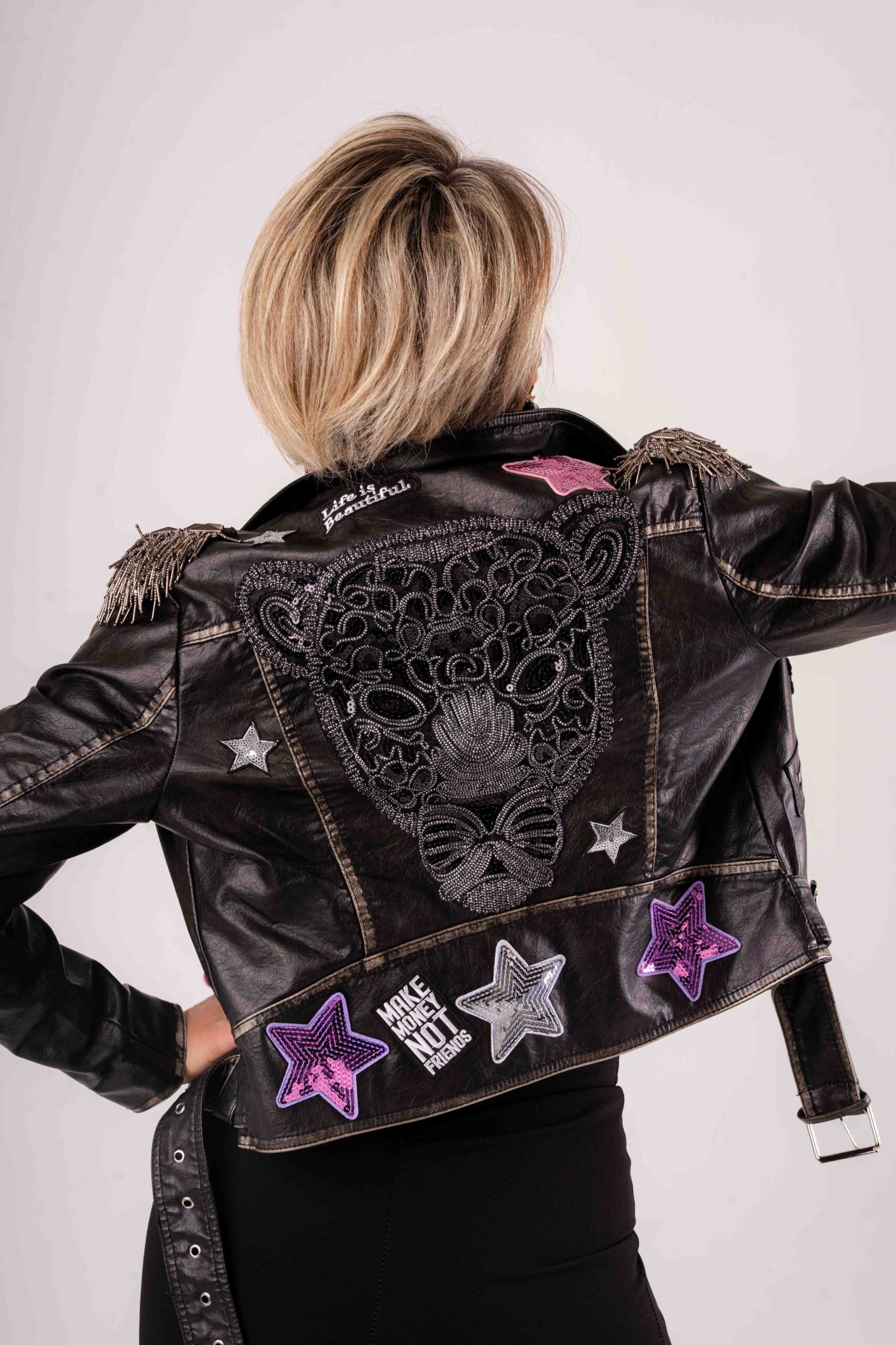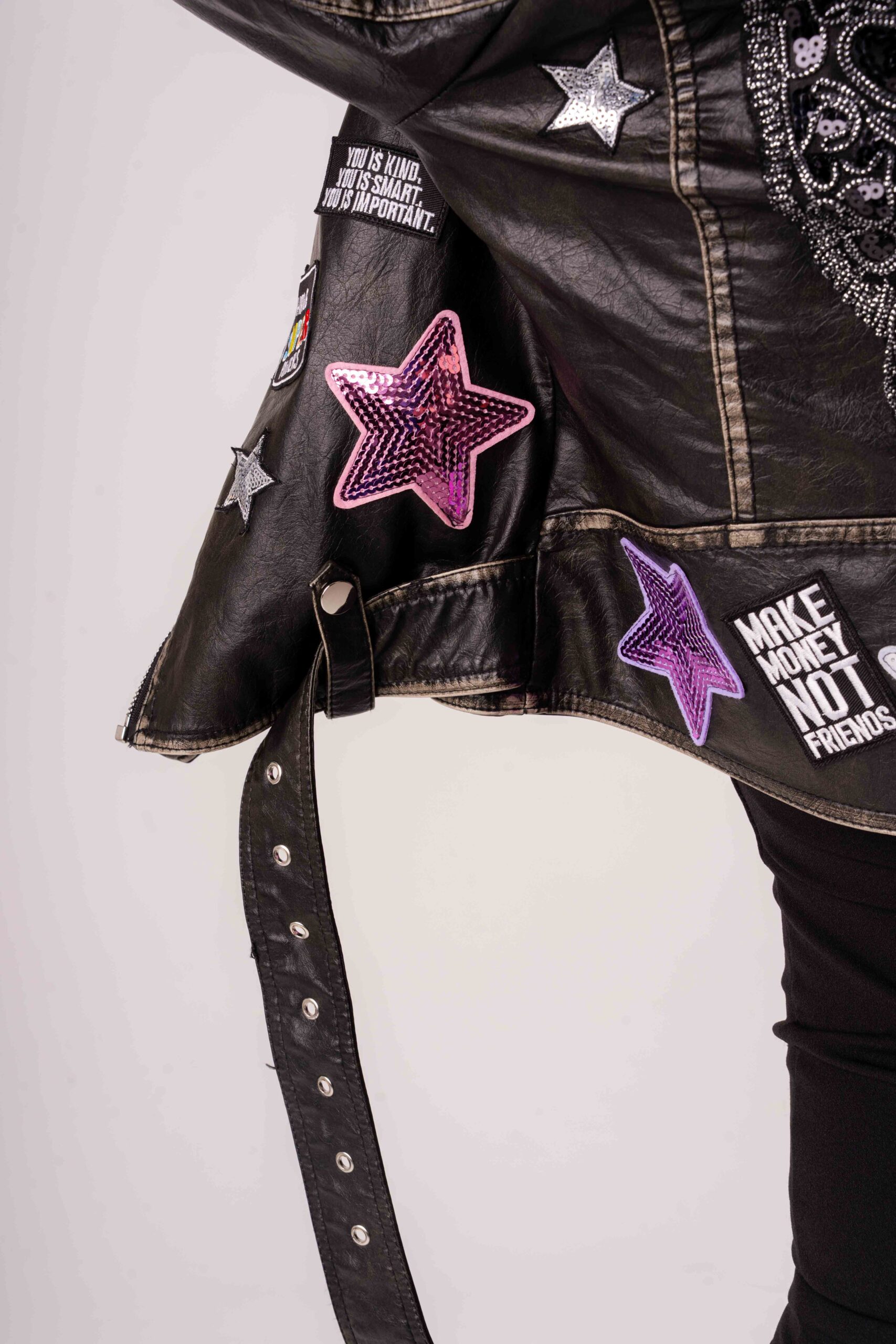 Eco pelle nera dal look grintoso Patch decorative a stelle Ricamo embrodery sul retro Spalle impreziosite da spalline in perline a pioggia Cintura regolabile in vita Vestibilità femminile e moderna Perfetto per look rock, casual chic e street style