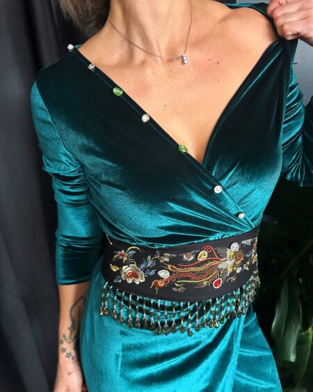 Cintura in tessuto ricamato con applicazioni di perline, swarovski e perle