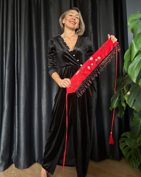 Cinta in tessuto rosso impreziosita da ricami decorativi e dettagli gioiello. Accessorio elegante per abiti da cerimonia e sera.