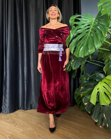 Cinta in tessuto rosso impreziosita da ricami decorativi e dettagli gioiello. Accessorio elegante per abiti da cerimonia e sera.