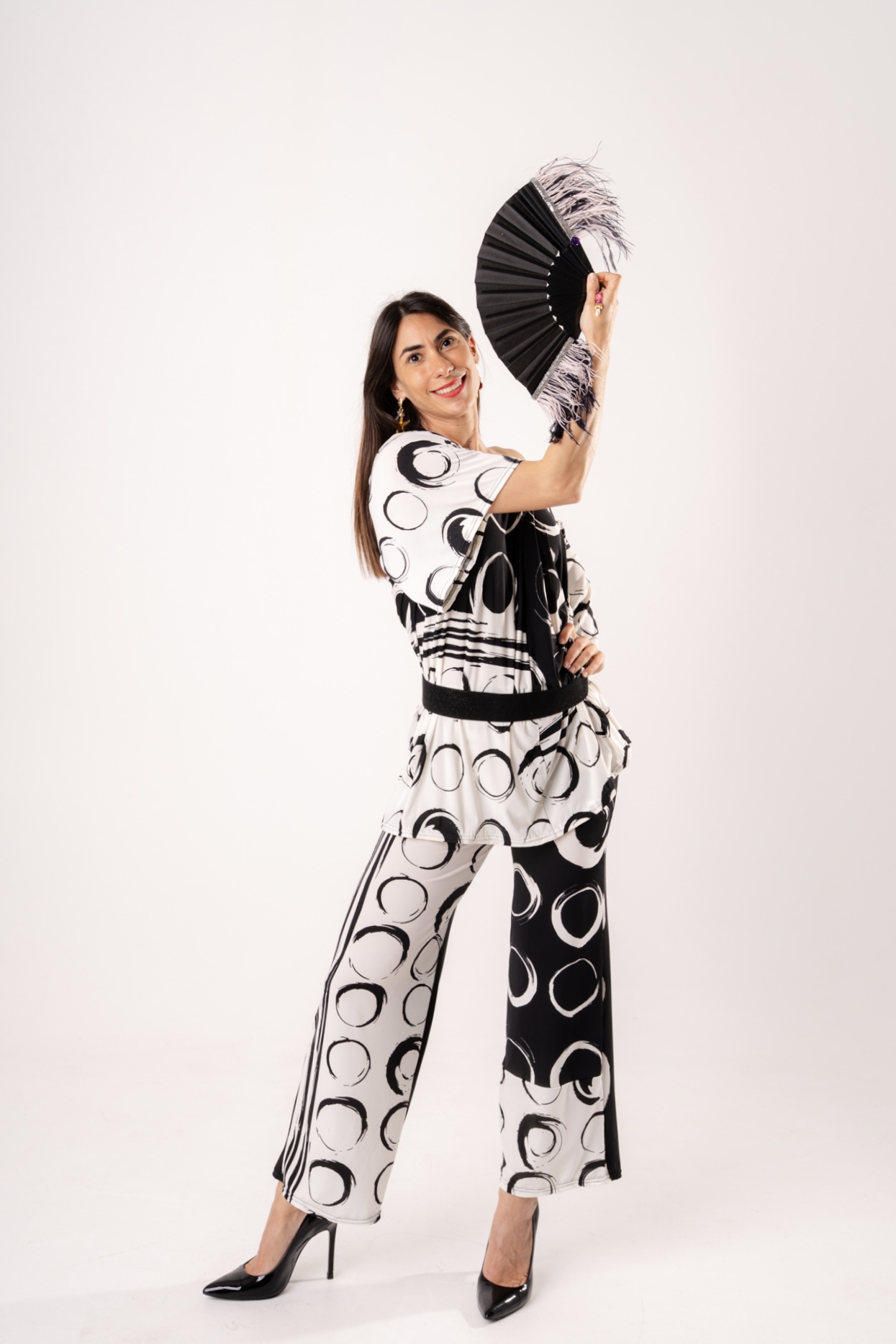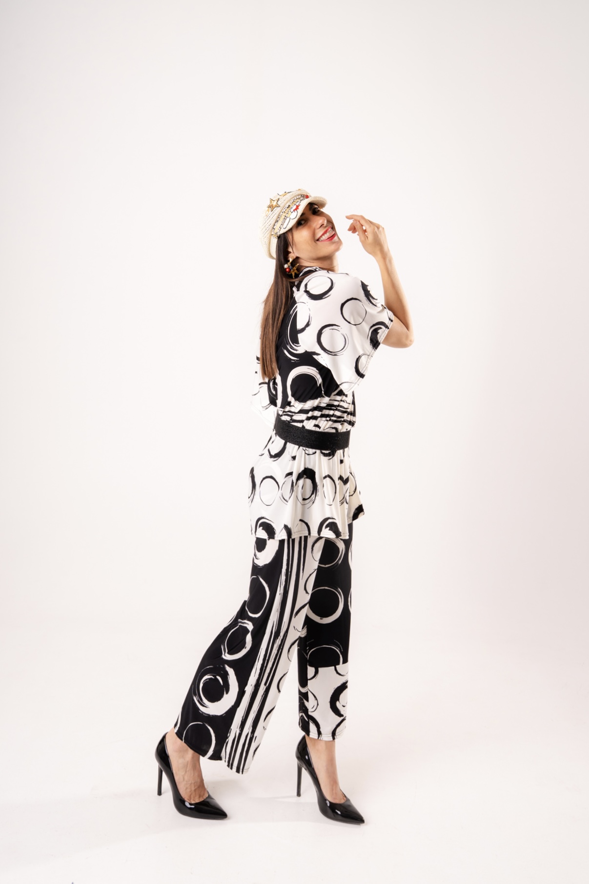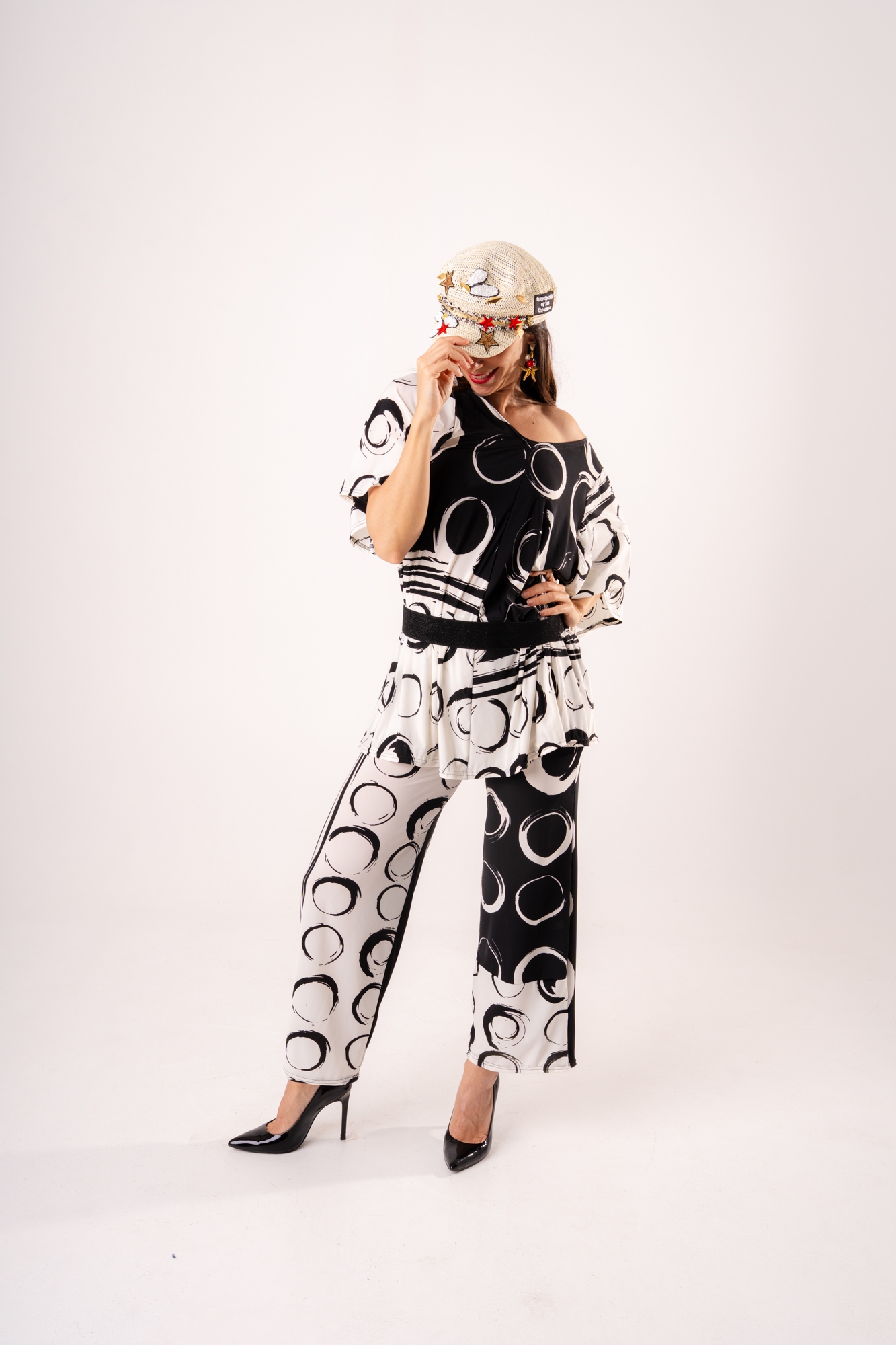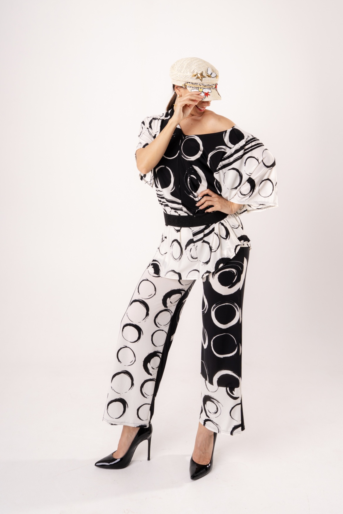 Rinnova il tuo stile con il nostro completo pantalone a fantasia geometrica circle-print. Tessuto fluido, vestibilità comoda e cintura inclusa per un look sofisticato. Ideale per cerimonie o serate speciali.