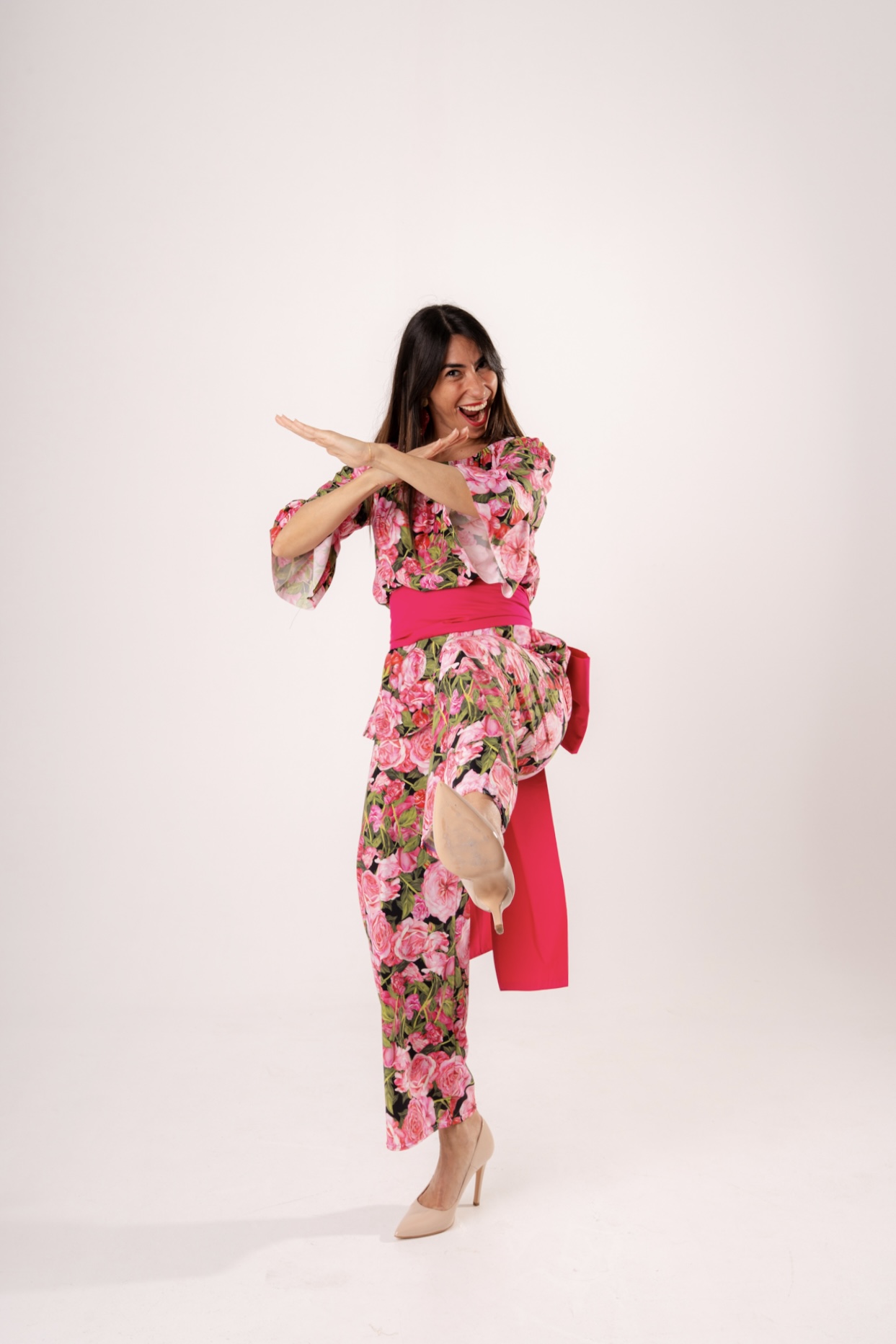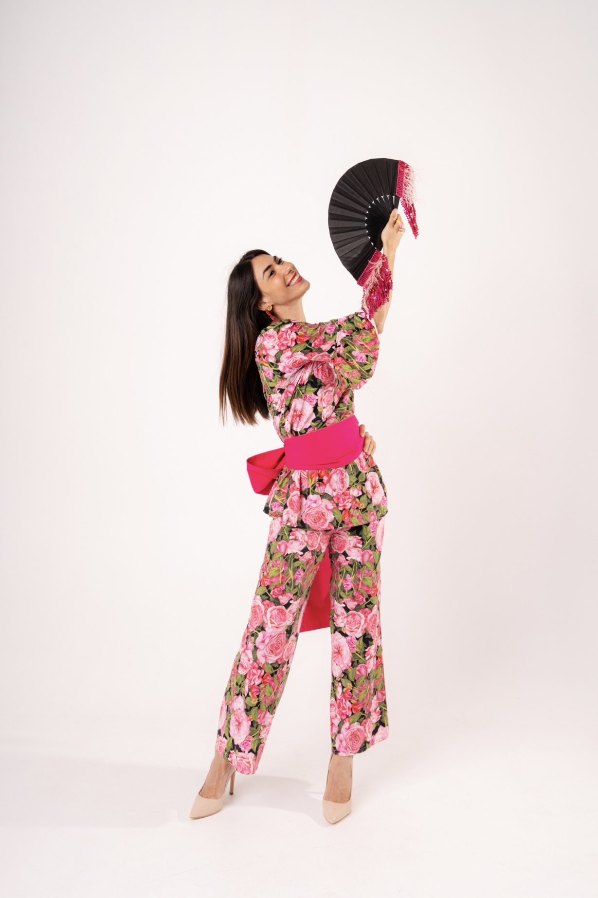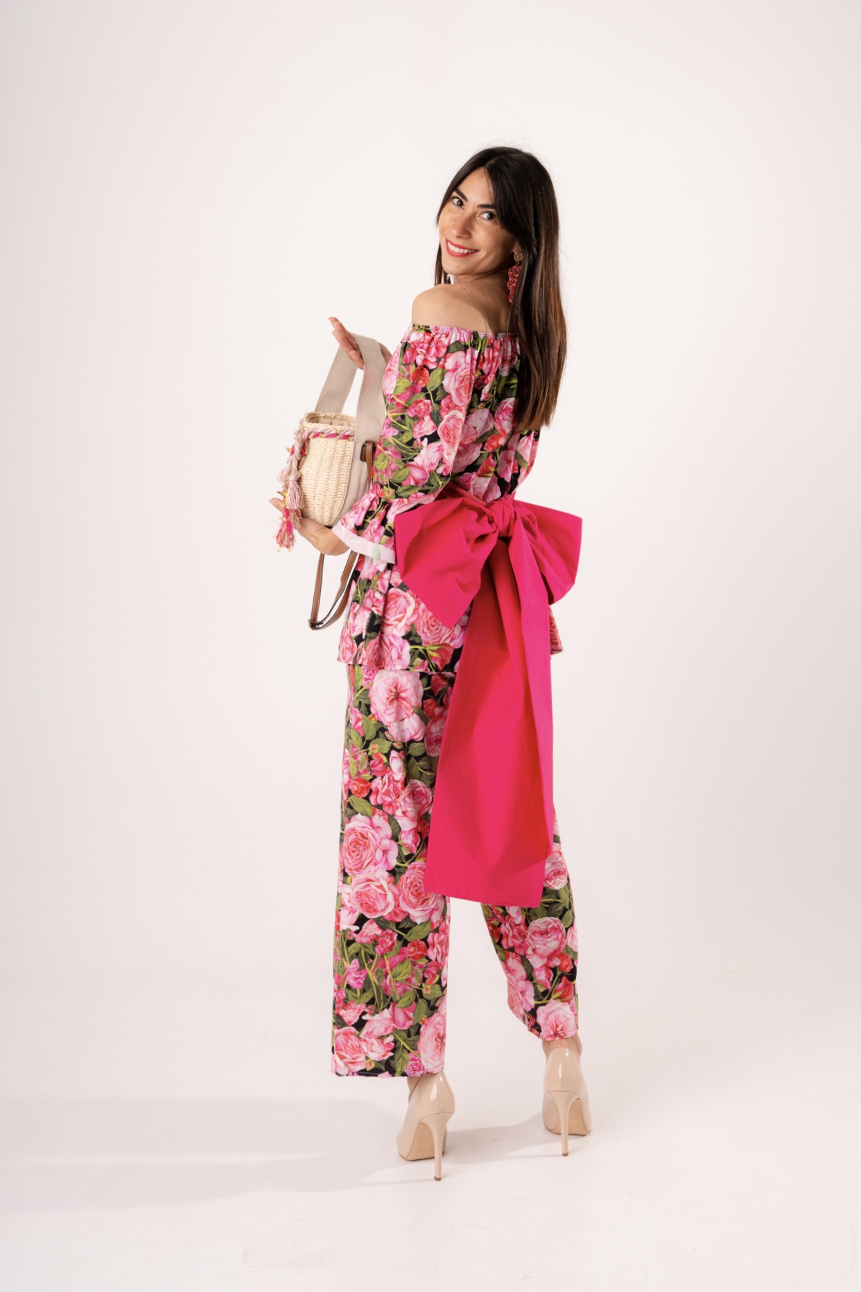 Completo Pantalone e Casacca Floreale con Fusciacca a Fiocco Fucsia