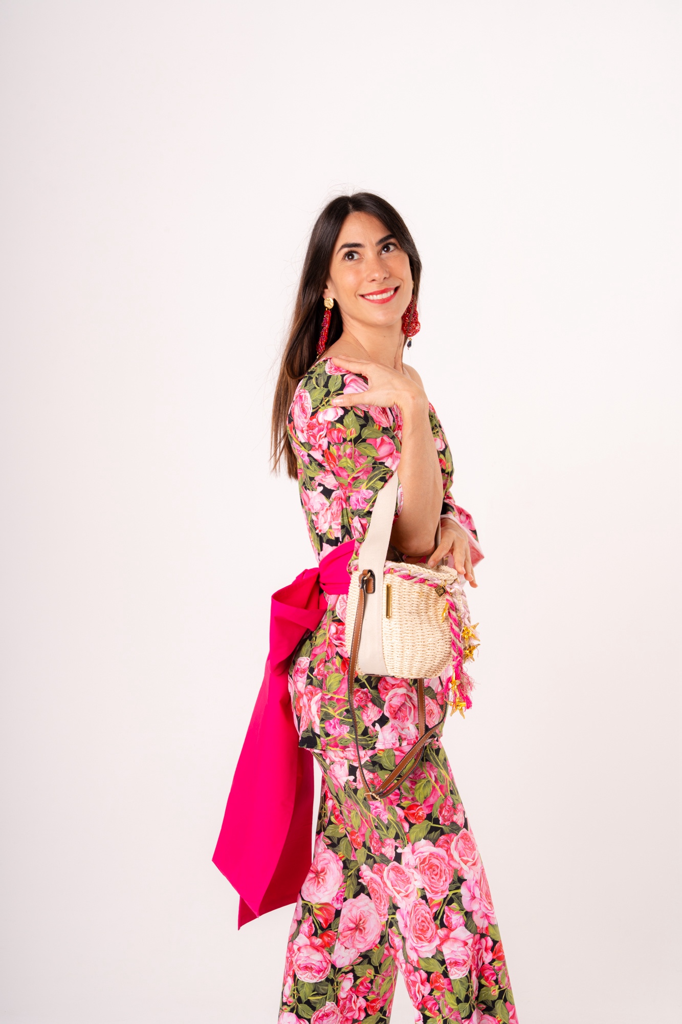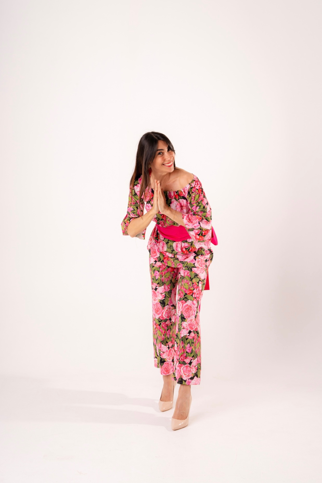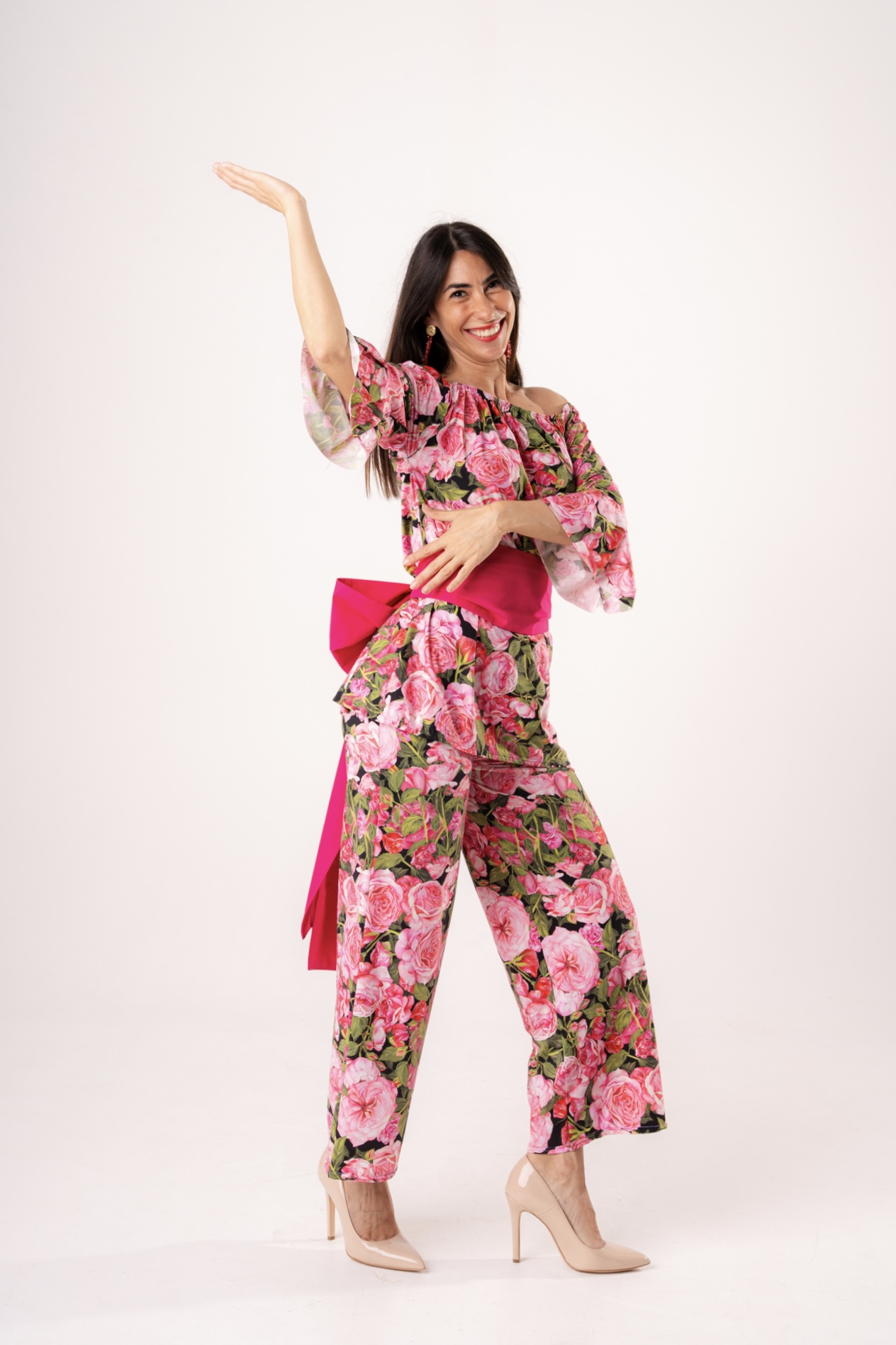 Completo Pantalone e Casacca Floreale con Fusciacca a Fiocco Fucsia