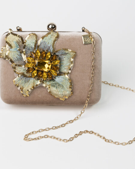 Borsa pochette modello Clutch in velluto color rosa cipria con applicazione floreale lavorata con castoni e paillettes; tracolla in catena oro.