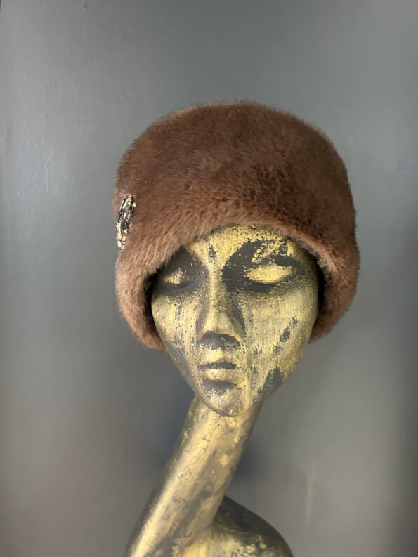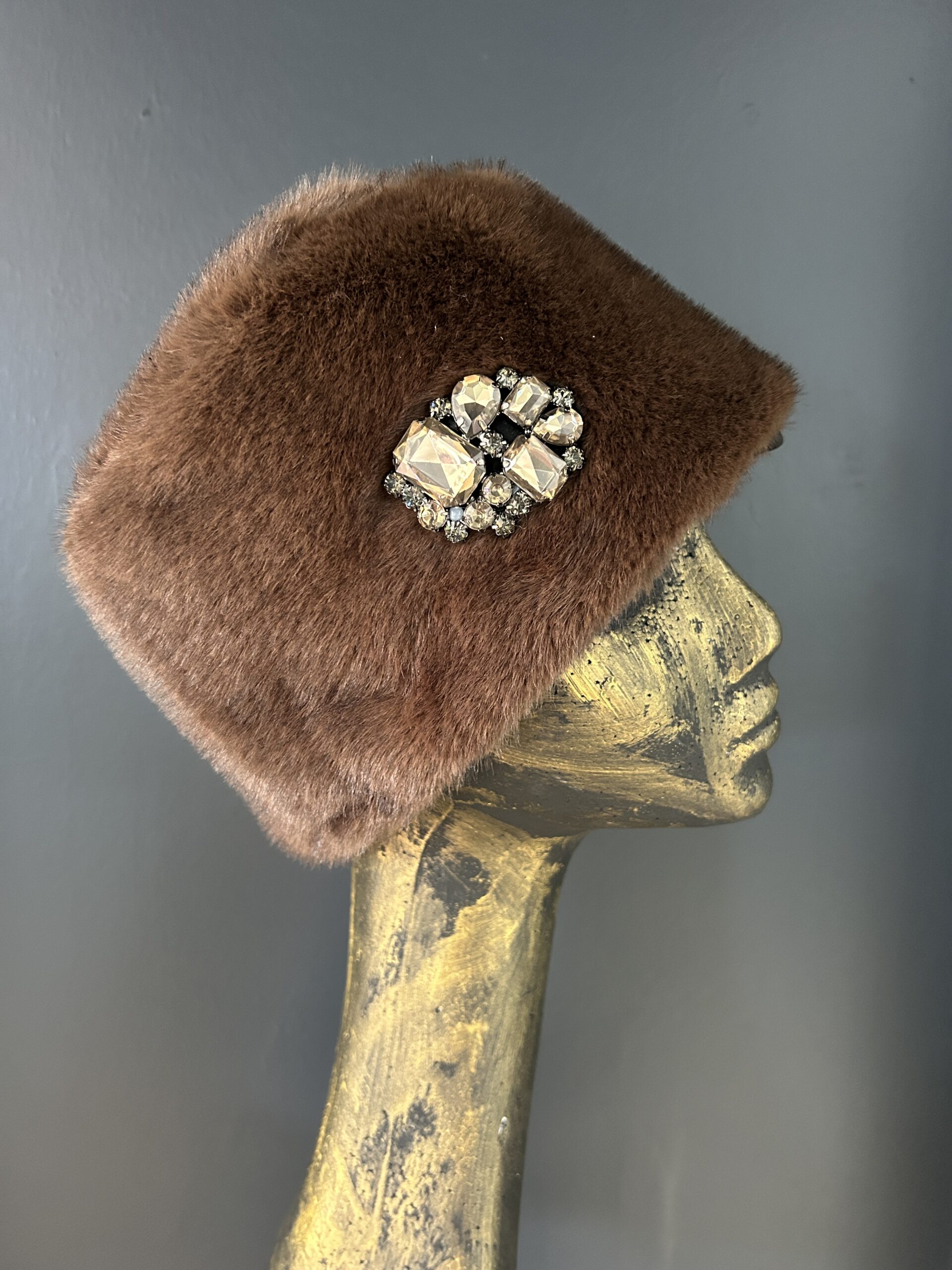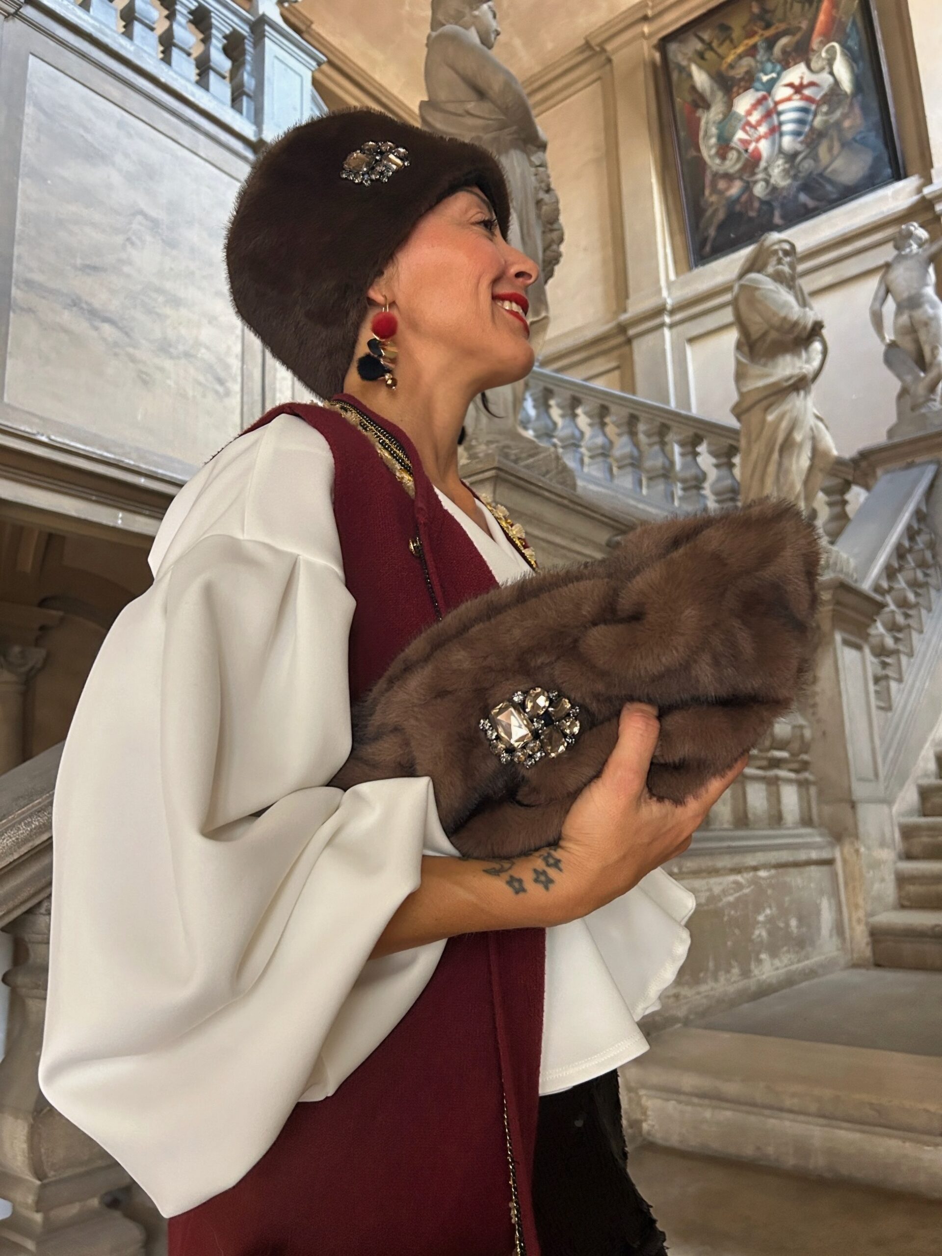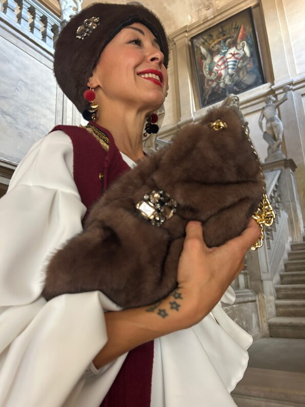 Coordinato composto da cappello modello Colbacco in visone-eco, arricchito da splendido castone di cristalli e borsa abbinata con catena removibile color oro e taschino interno