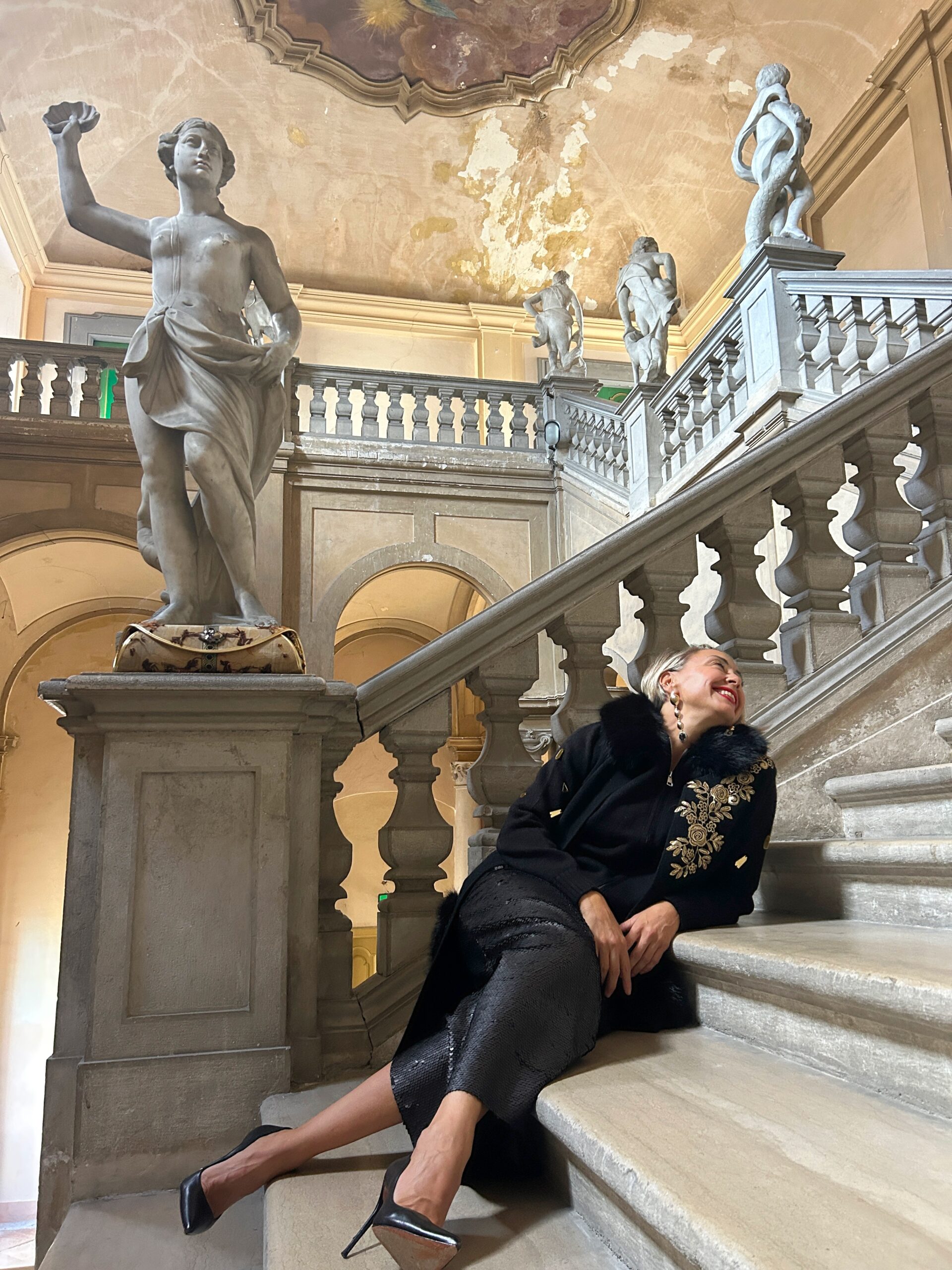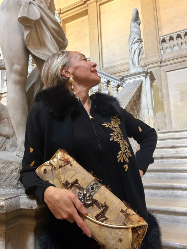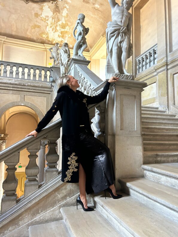 - Gilet aperto lungo nero, in viscosa invernale con dettagli floreali ricamati color oro davanti e dietro. Le tasche sono di pellicciotto eco. Taglia unica. Misure: giroseno 94 cm – Lunghezza 115 cm
