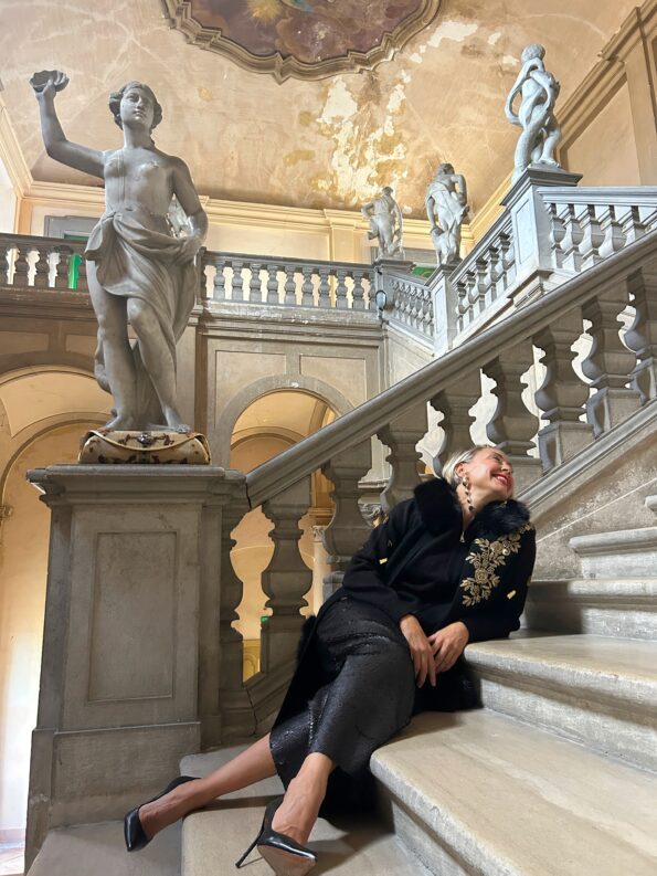 Sovragonna nera in tulle con cinta in embroidery in argento ed oro.