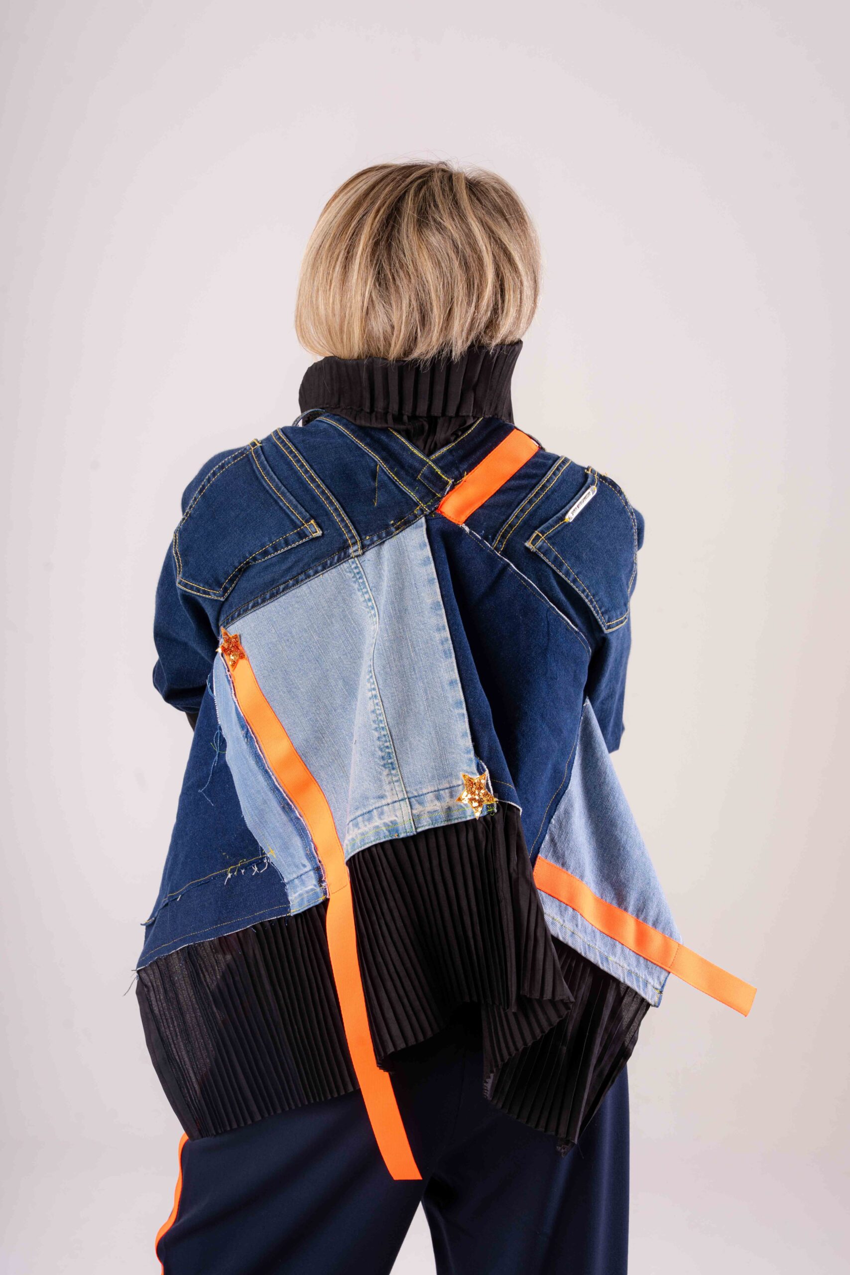 Realizzata attraverso un processo di destrutturazione e ricomposizione di jeans, che trasforma il denim in un capo scultoreo e architettonico. Le maniche sono costruite a pannelli sovrapposti con lavorazioni a fasce, creando un effetto tridimensionale che richiama
