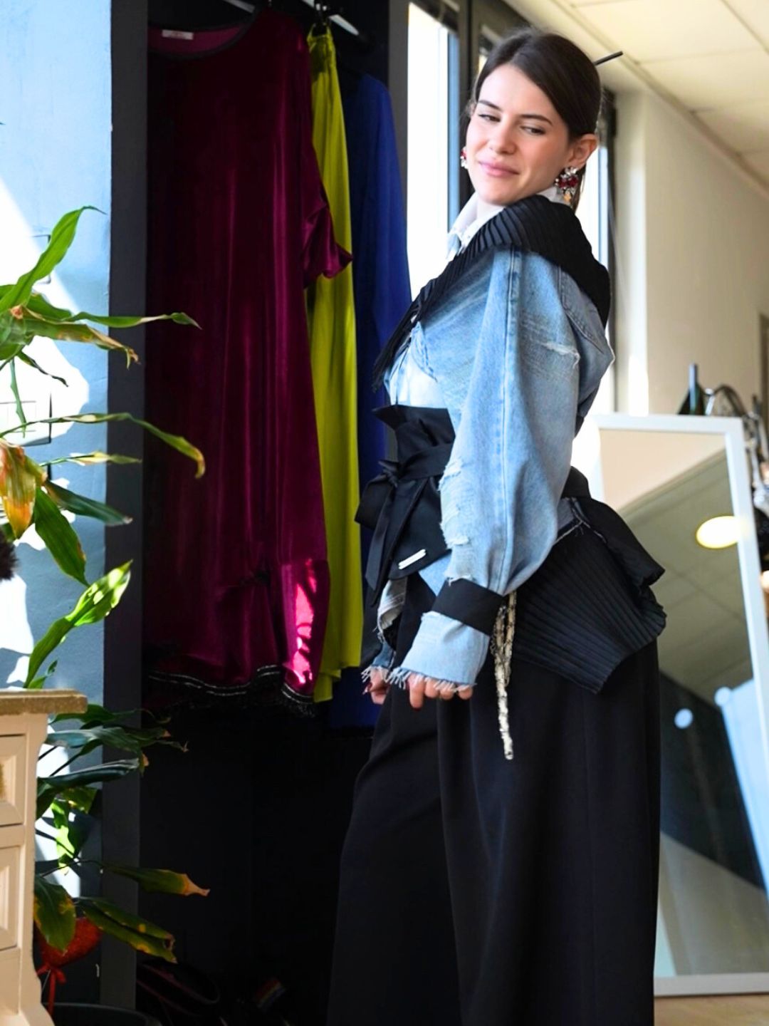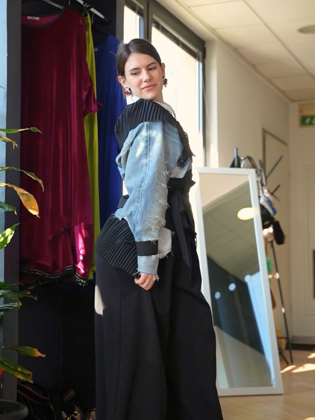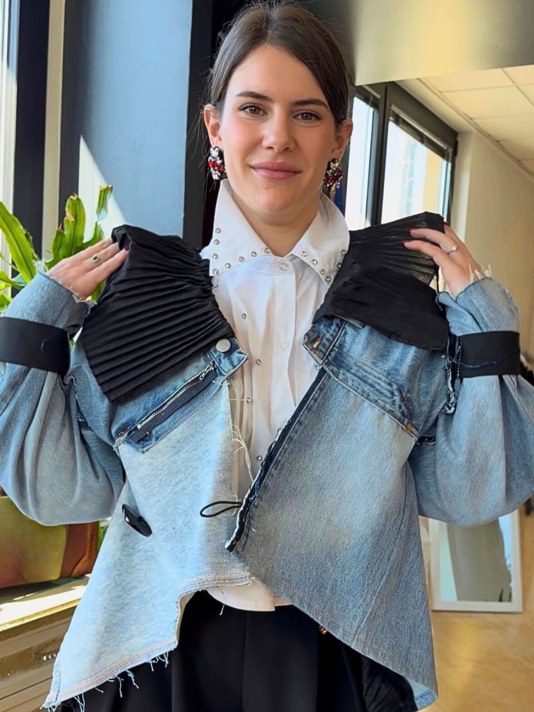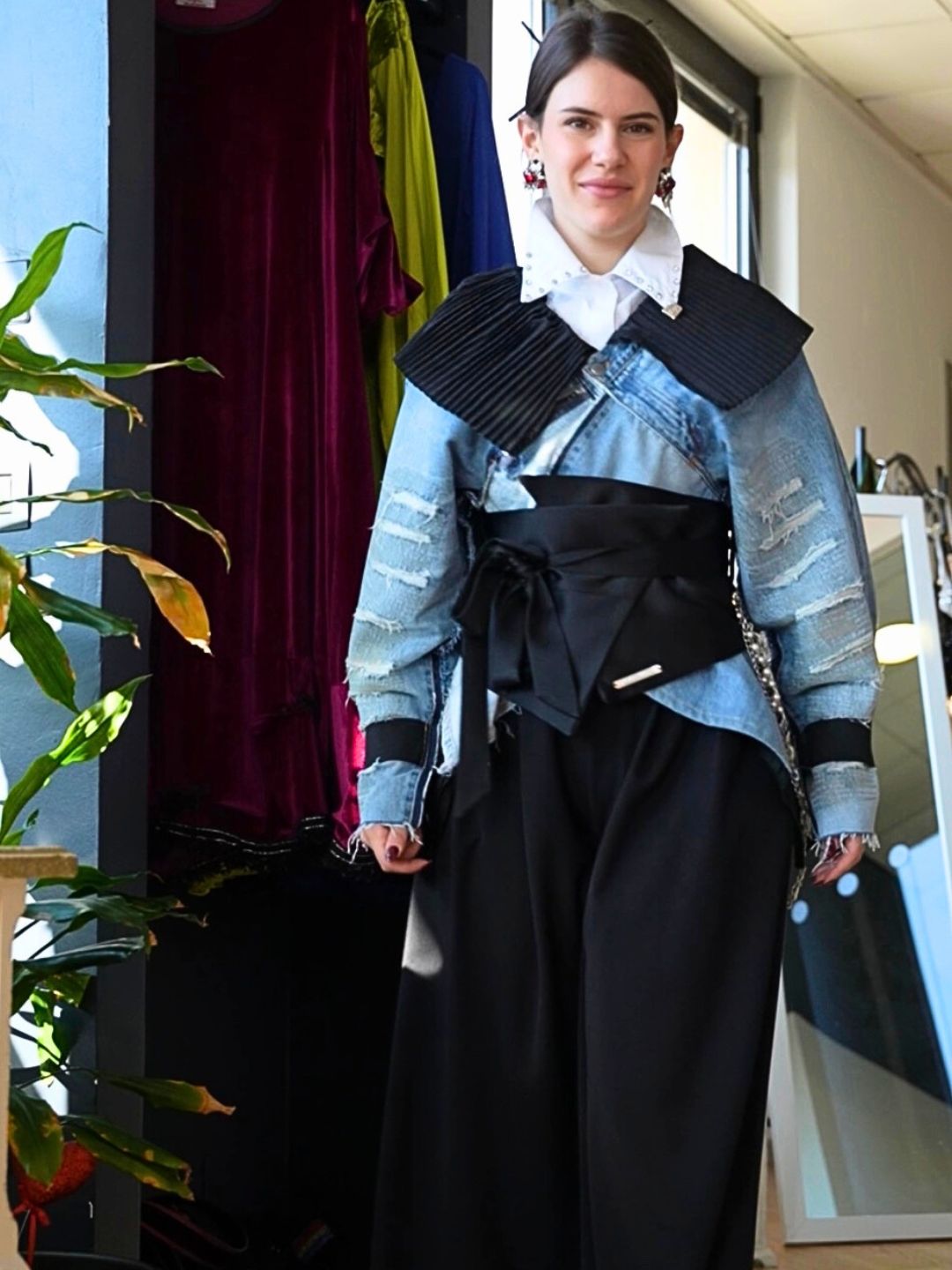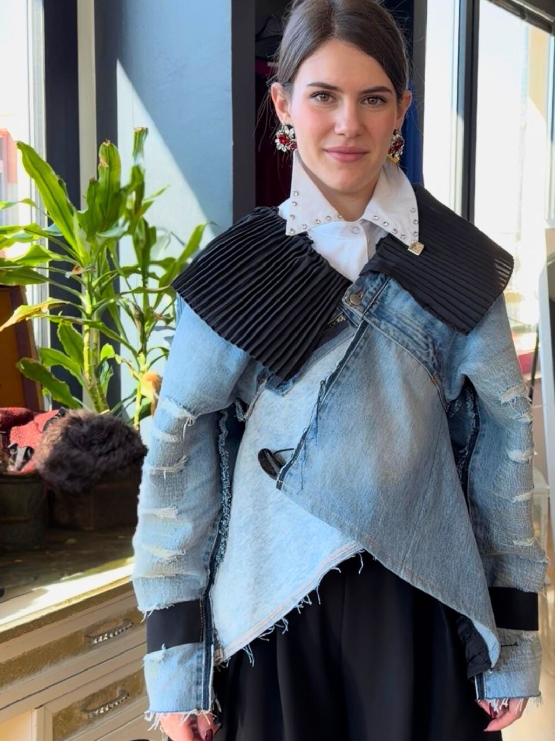 Realizzata attraverso un processo di destrutturazione e ricomposizione di jeans, che trasforma il denim in un capo scultoreo e architettonico. Le maniche sono costruite a pannelli sovrapposti con lavorazioni a fasce, creando un effetto tridimensionale che richiama
