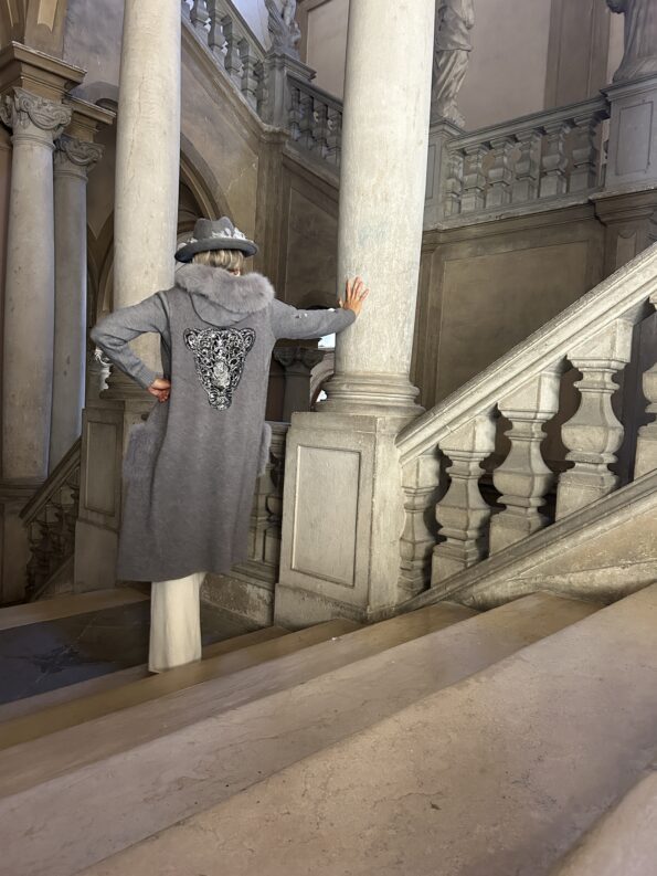 Gilet aperto lungo grigio, in viscosa invernale con bottoni perlati e patch lavorato con paillettes argento e nero. Le tasche sono ricoperte di pellicciotto eco. Taglia unica