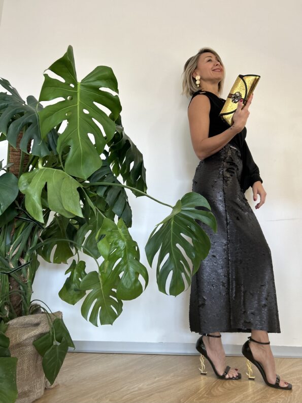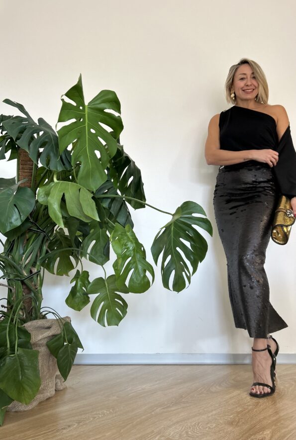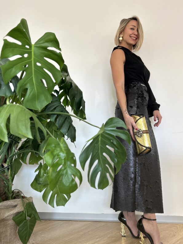 Gonna lunga ricoperta di paillettes nere con spacco e cerniera dietro.