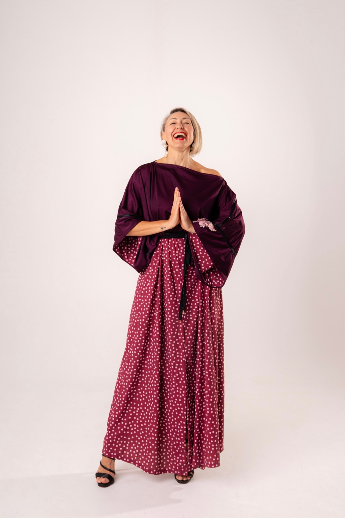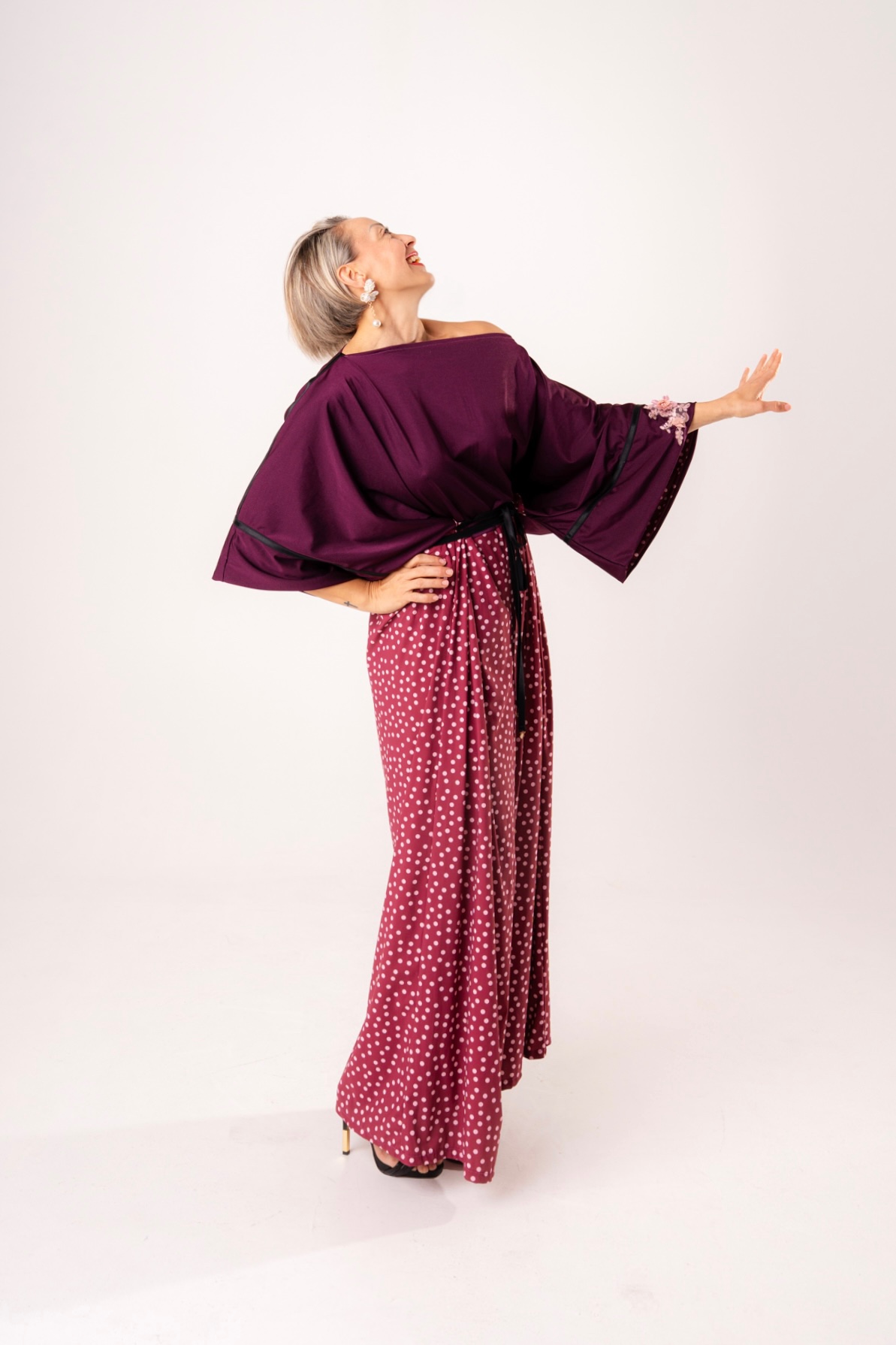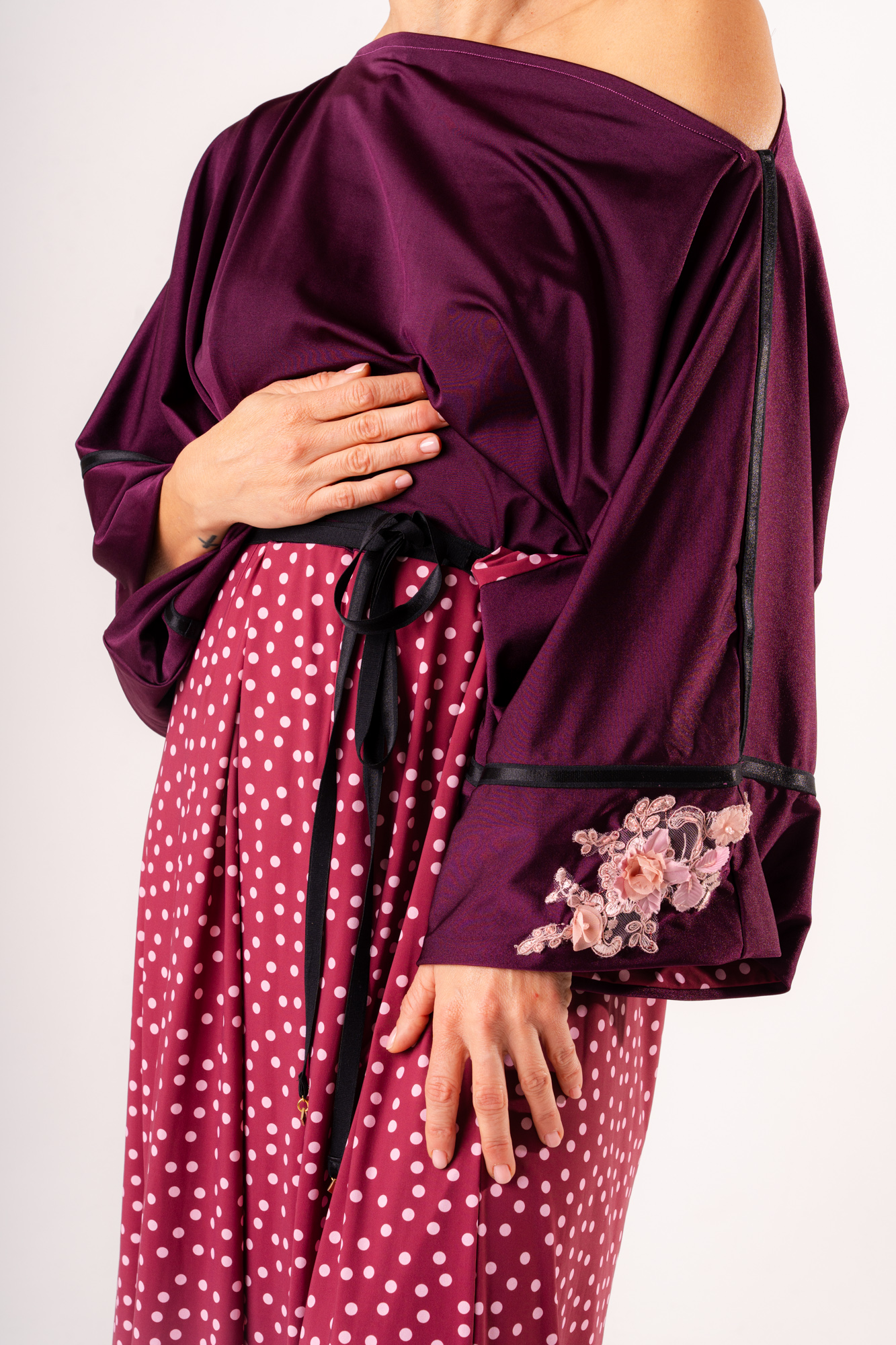 Eleva il tuo stile con questo abito intero dal design scenografico, perfetto per chi cerca un equilibrio tra eleganza sartoriale e ispirazione giapponese. Questo modello unico combina un corpino fluido color melanzana con una gonna ampia a micro-pois, creando l’illusione di un sofisticato completo in un unico pezzo facile da indossare.