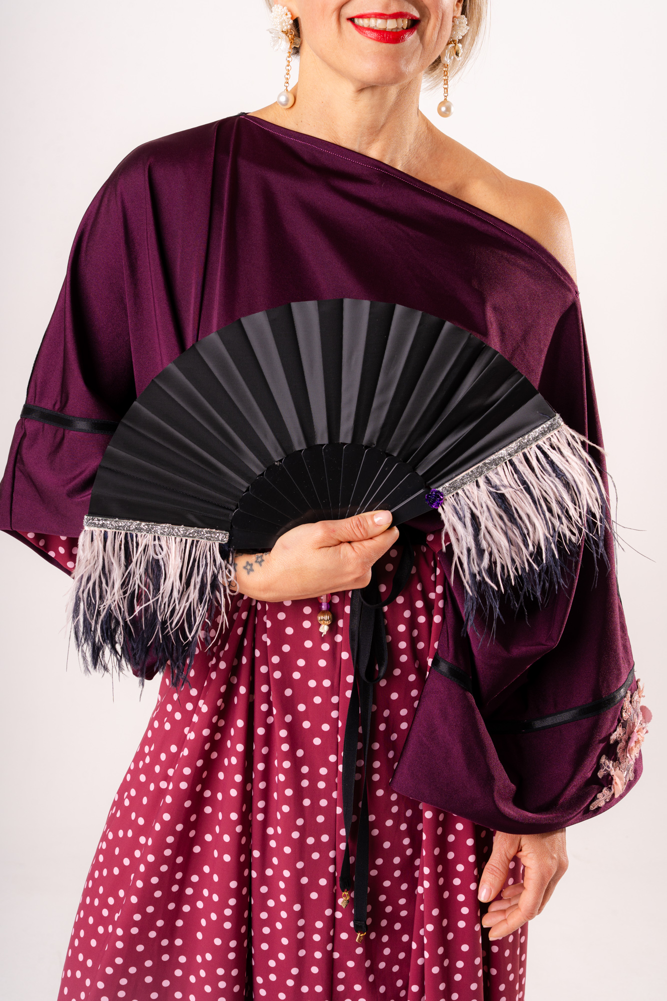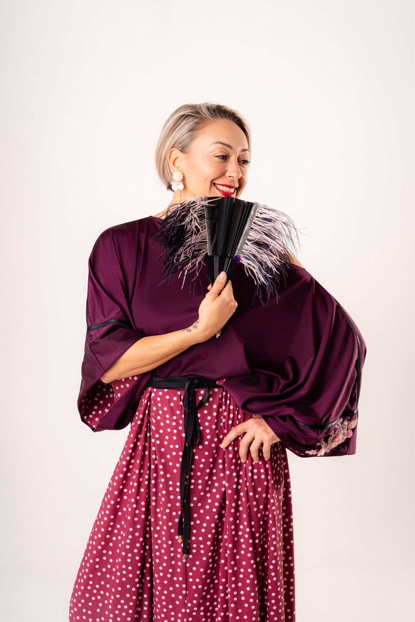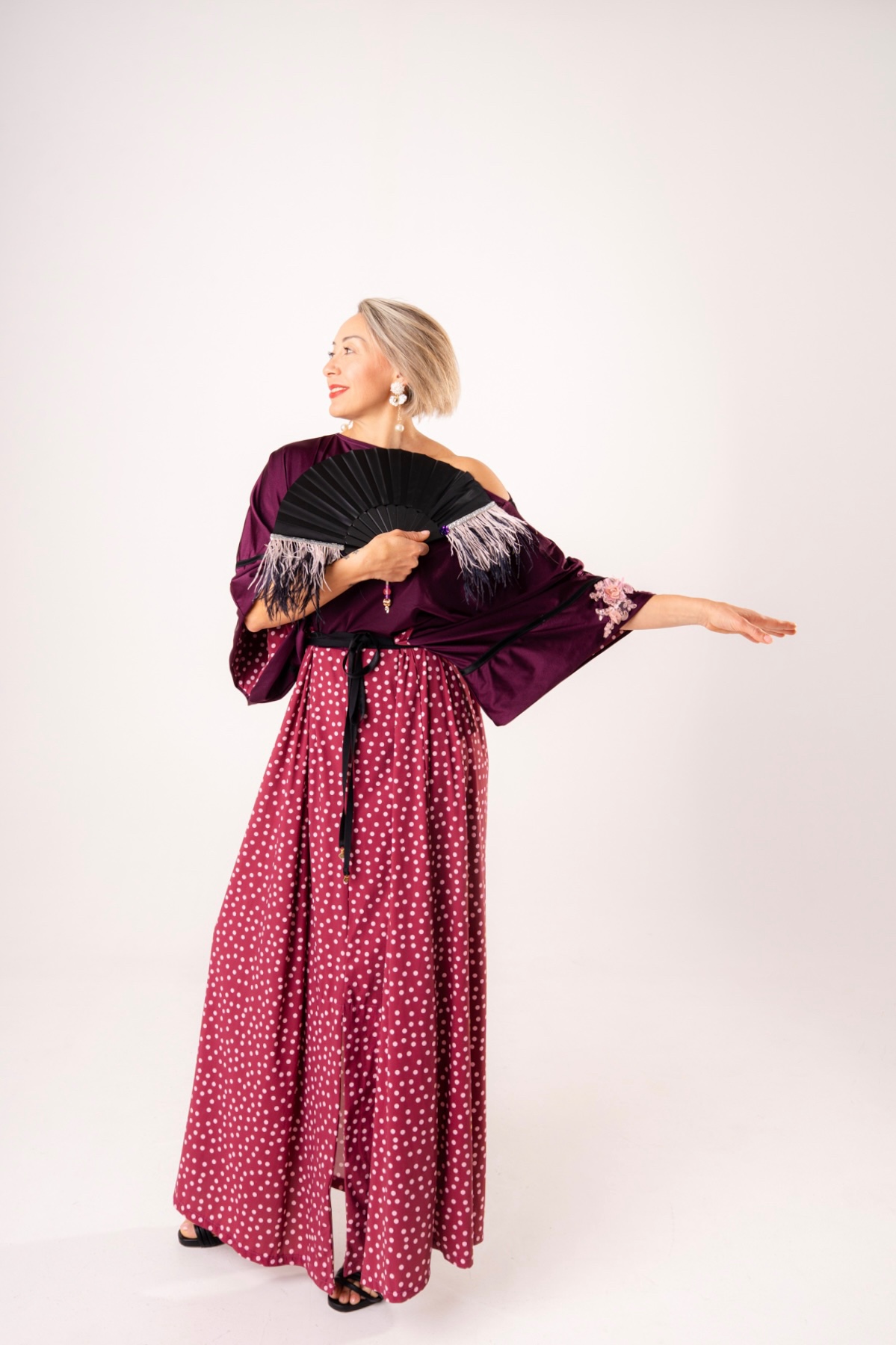 Eleva il tuo stile con questo abito intero dal design scenografico, perfetto per chi cerca un equilibrio tra eleganza sartoriale e ispirazione giapponese. Questo modello unico combina un corpino fluido color melanzana con una gonna ampia a micro-pois, creando l’illusione di un sofisticato completo in un unico pezzo facile da indossare.