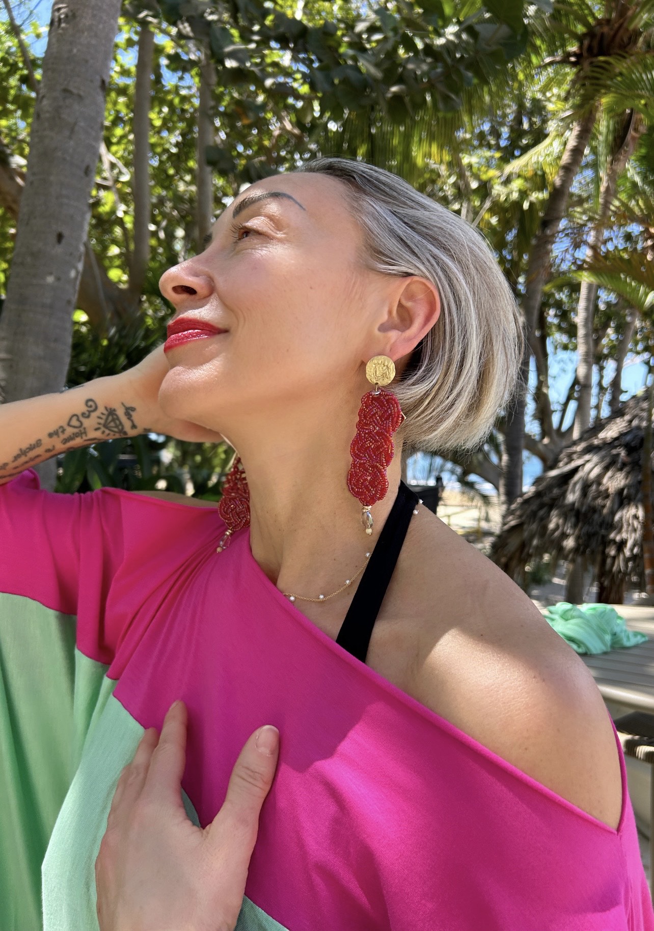 Orecchini pendenti donna dal design raffinato e d’impatto, perfetti per completare look eleganti e outfit sofisticati. Il modello presenta una base tonda color oro abbinata a una lavorazione intrecciata rosso fragola dal forte carattere, che dona luce e movimento al viso.