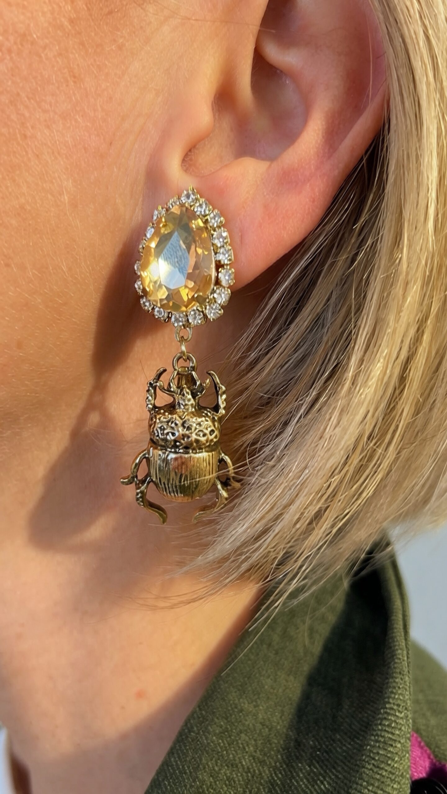 Orecchini a Clip Vintage Gold con Scarabeo Portafortuna e Cristallo Goccia Amber.