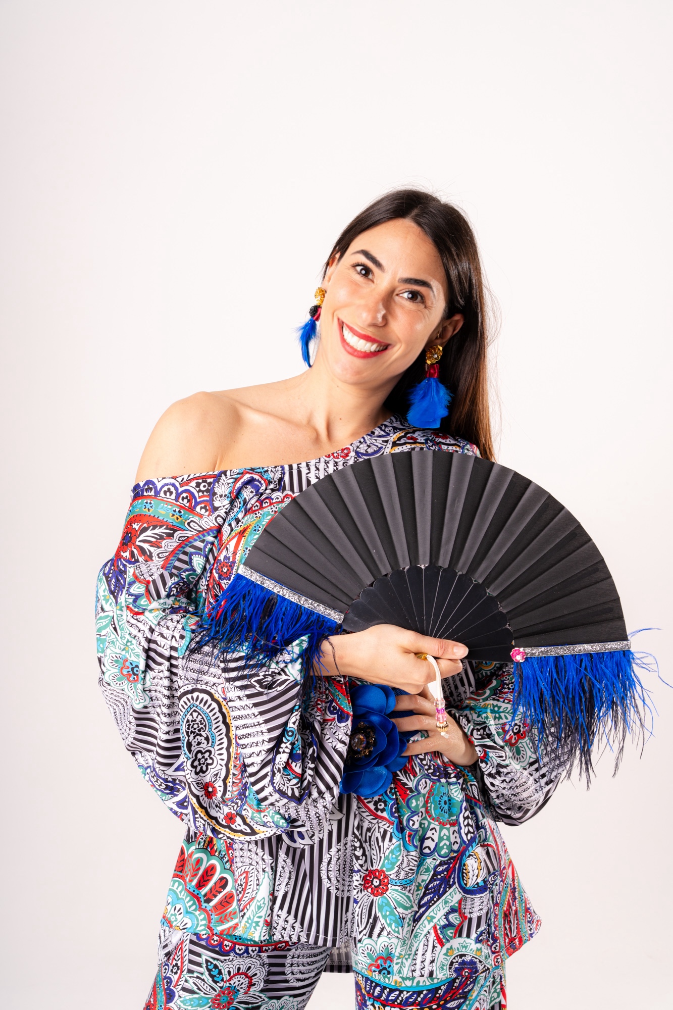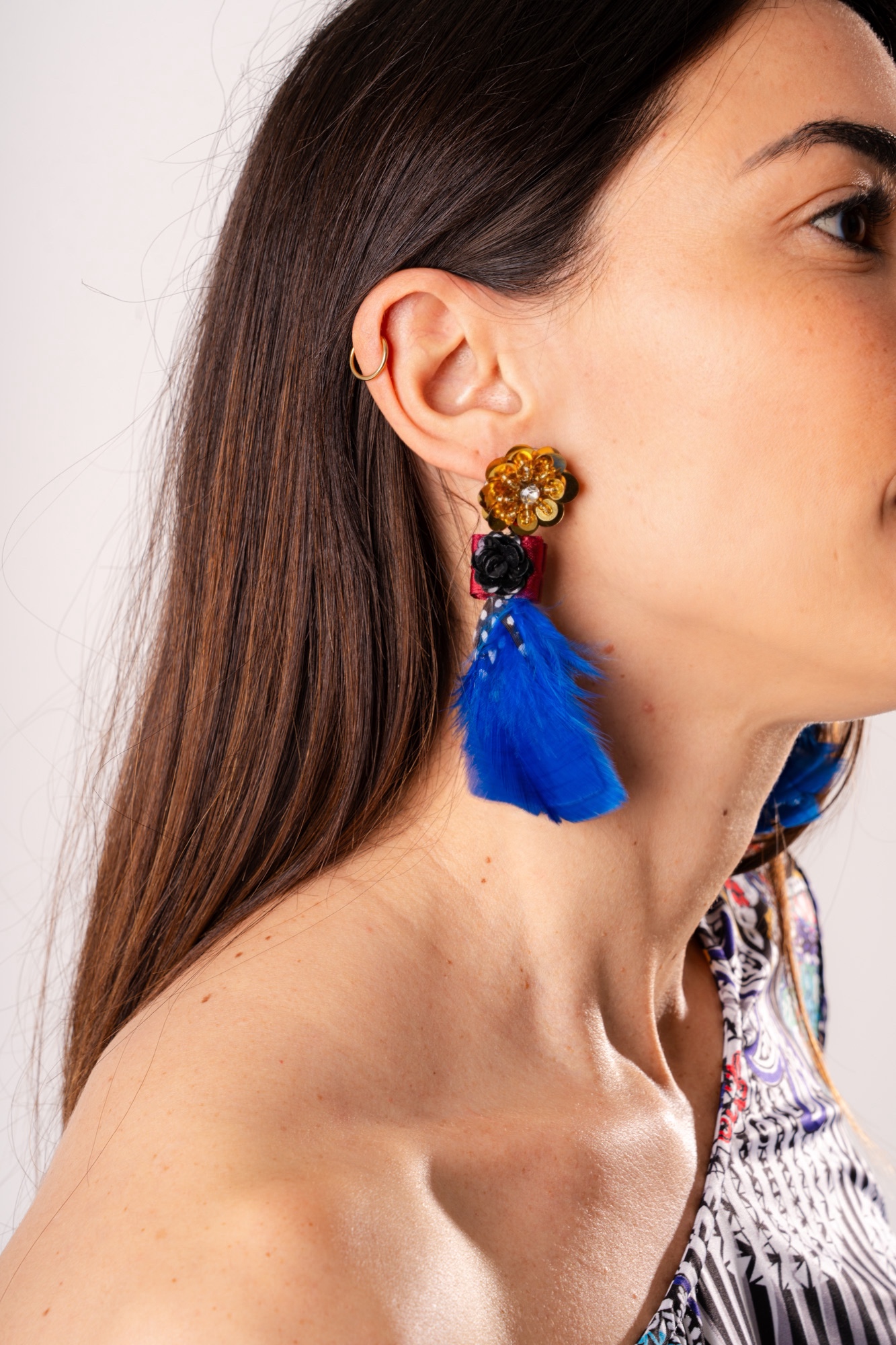 Design Esclusivo: Composizione multistrato caratterizzata da un fiore dorato in paillettes, un inserto floreale nero e una cascata di piume blu cobalto.