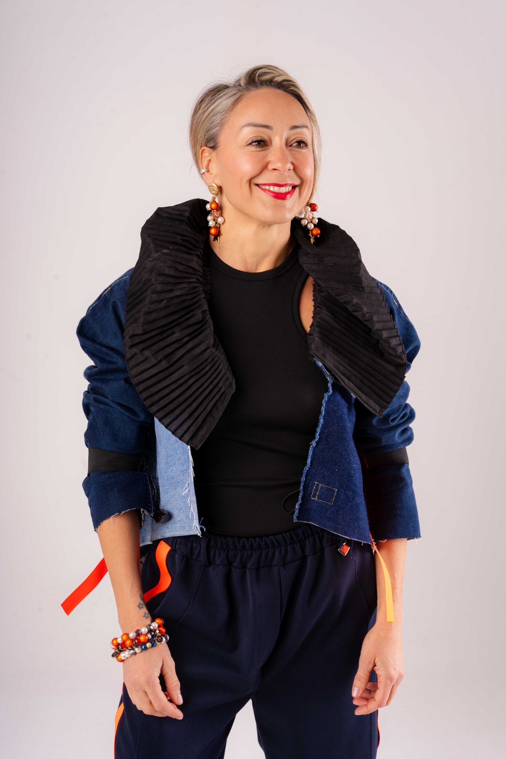 Orecchini con clip con stelle in paillettes color argento, perline colorate e frange nere in tessuto