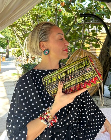Orecchini con clip con stelle in paillettes color argento, perline colorate e frange nere in tessuto