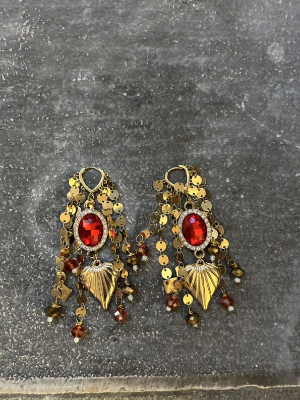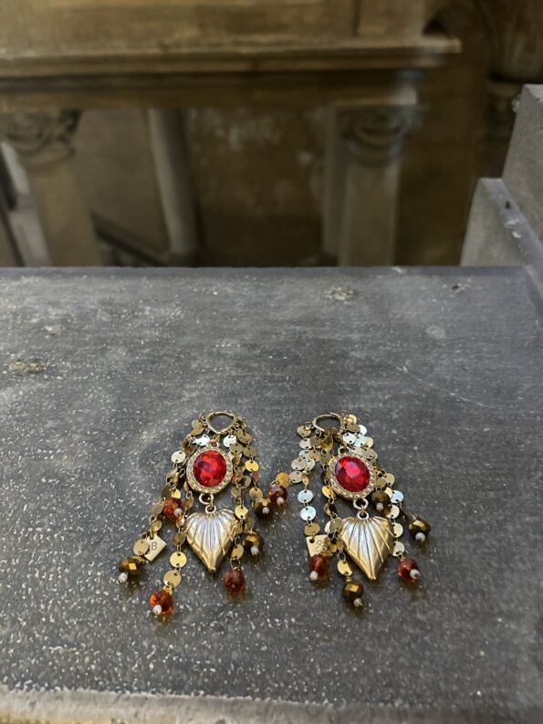 Bellissimi orecchini lunghi, a buco, color oro con pendenti rossi Swarovski e cuori