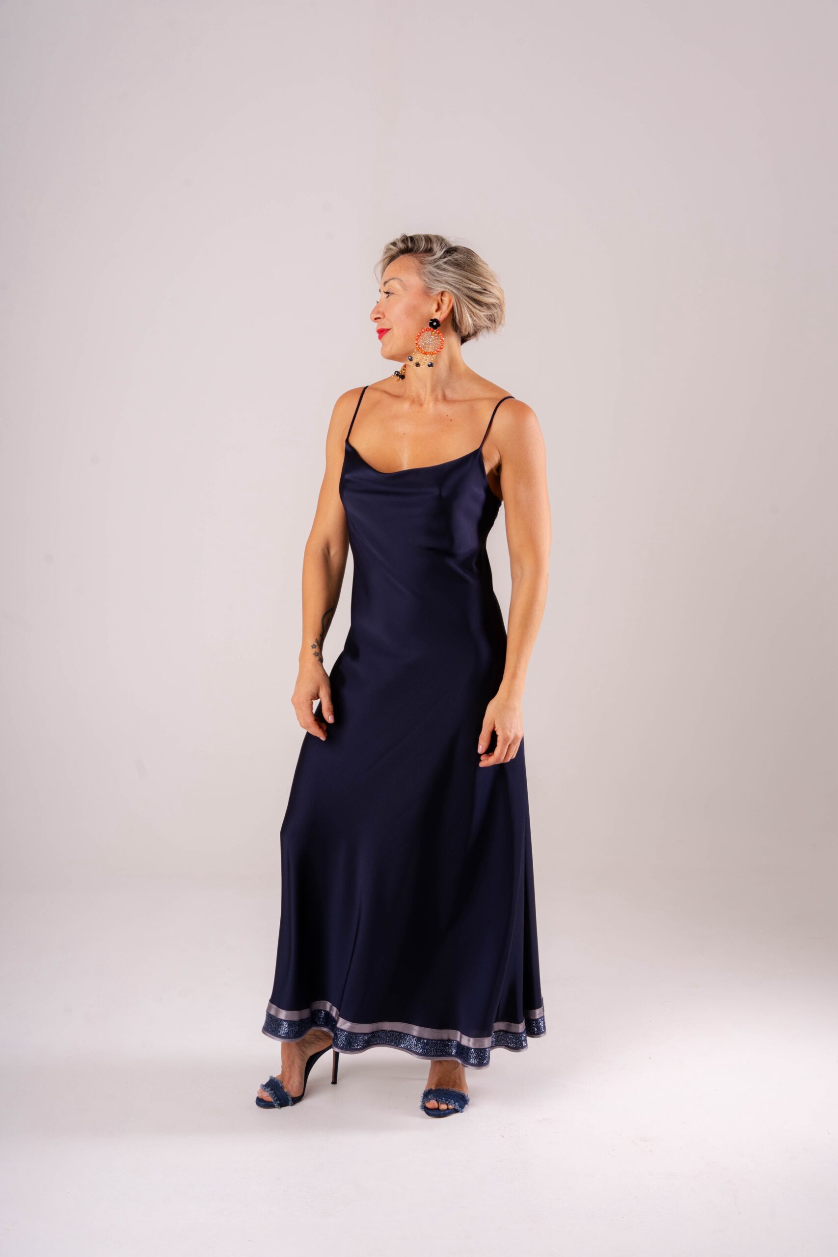 Elegante, fluido e raffinato: questo abito lungo satinato blu notte da donna è la scelta perfetta per cerimonie, eventi e serate speciali. Il tessuto satin lucido in viscosa scivola delicatamente sulla silhouette valorizzando la figura, mentre le spalline sottili e il taglio minimal donano un look sofisticato e moderno. Il bordo decorativo sul fondo aggiunge un dettaglio luminoso che rende l’abito ancora più esclusivo.