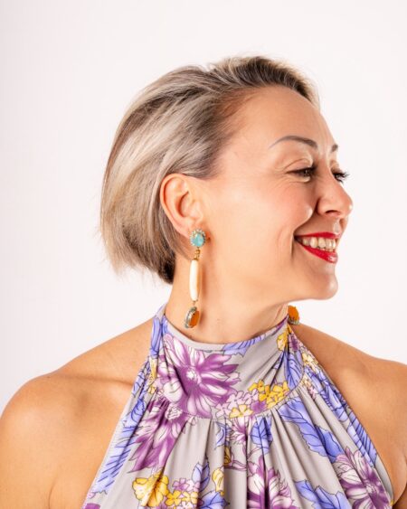 Orecchini a buco realizzati con cristalli, pietre dure avorio e pietre marmorizzate (base color oro e turchese)